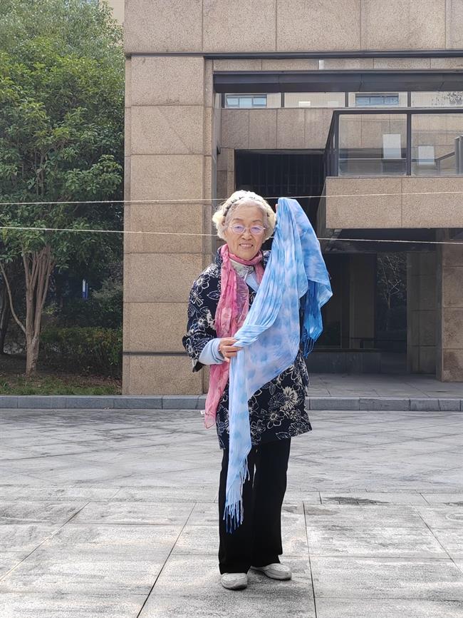 扎染體驗(yàn)活動(dòng)中,老人們?cè)趲熒鷪F(tuán)隊(duì)的幫助下通過(guò)扎、縫、縛、綴、夾等看似無(wú)跡可尋的操作技巧,并參與靛藍(lán)上色和拆線晾曬,制作出了獨(dú)一無(wú)二紋樣的圍巾。