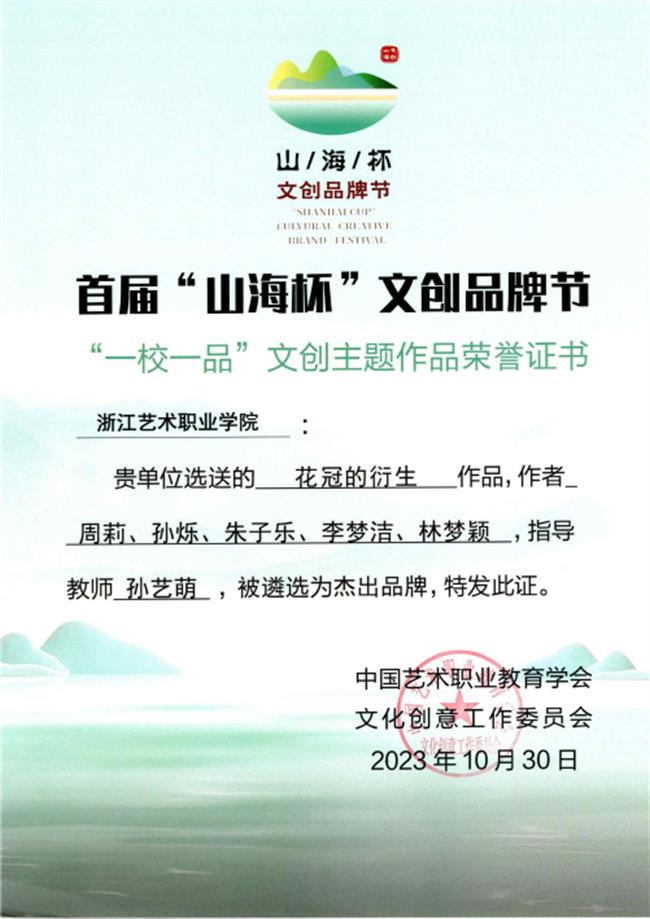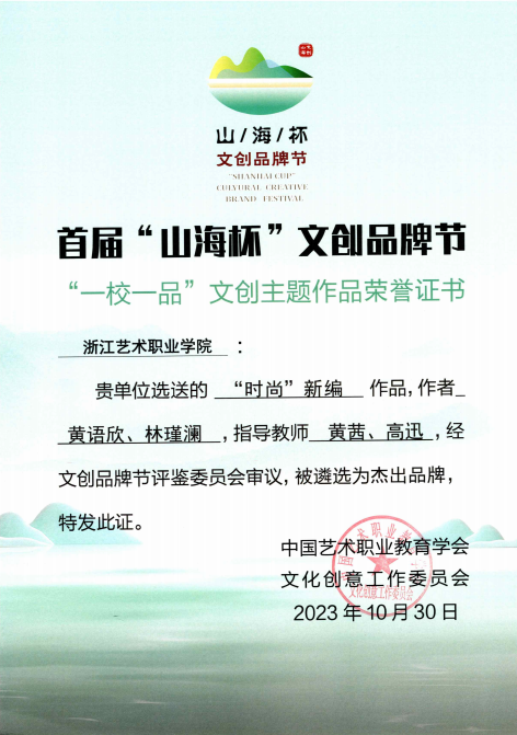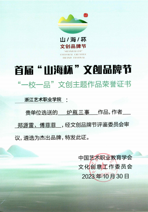 在首屆“山海杯”文創(chuàng)品牌節(jié)“一校一品”的評選中,浙江藝術(shù)職業(yè)學(xué)院以手工藝主題作品展榮獲“一校一品”杰出品牌,成為全國8個杰出品牌之一。我院選送參展的7項文創(chuàng)主題作品,全部榮獲“一校一品”文創(chuàng)主題作品杰出品牌獎并展出。首屆“山海杯”文創(chuàng)品牌節(jié)“一校一品”活動由中國藝術(shù)職業(yè)教育學(xué)會指導(dǎo)、中國藝術(shù)職業(yè)教育學(xué)會文化創(chuàng)意工作委員會主辦。