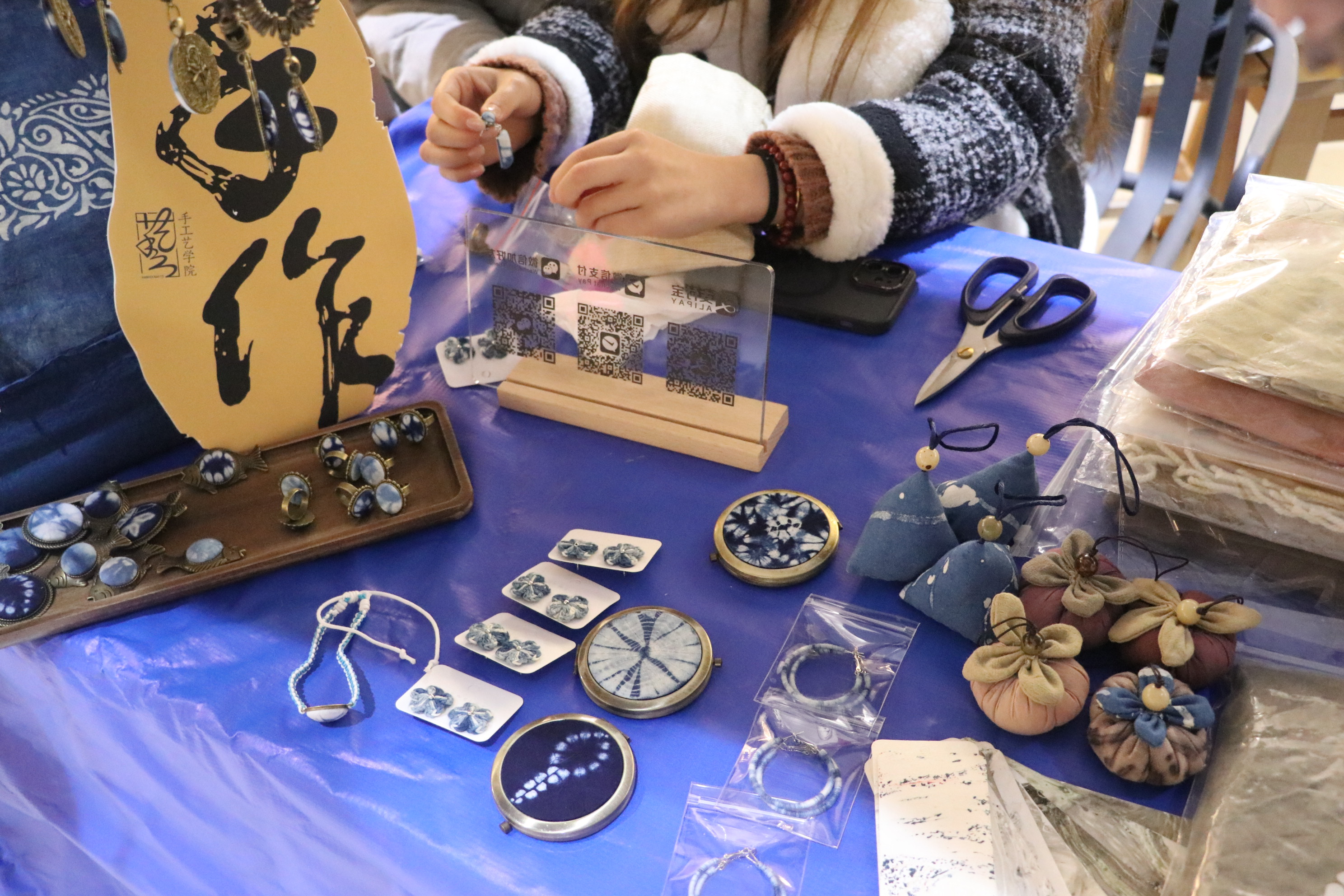 活動(dòng)當(dāng)天,賞燈游園會(huì)區(qū)域,在手工藝學(xué)院的學(xué)生們的攤位上,草木染圍巾、飾品、藍(lán)染年歷、水印木刻掛歷、竹編花燈、青瓷花口杯、手工手鏈、掛飾、書簽……傳統(tǒng)手工藝品琳瑯滿目,引得游客紛紛駐足。學(xué)生利用自身所學(xué)知識(shí),在傳統(tǒng)技藝的基礎(chǔ)上融合起新春、元宵的元素,充分推廣傳統(tǒng)手工藝的獨(dú)特魅力,通過靜態(tài)展陳和動(dòng)態(tài)展演讓古老手藝煥發(fā)出新的生機(jī),讓游客近距離感受到非遺之美,體會(huì)別樣的年味。