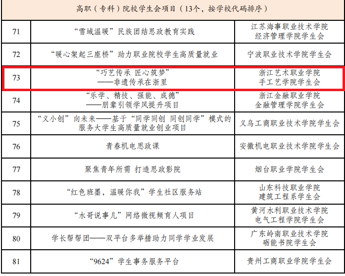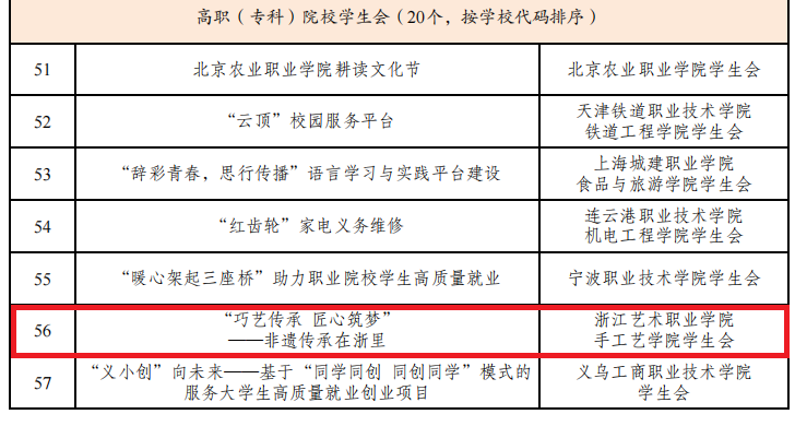 匠心手藝 文化傳承,浙江藝術(shù)職業(yè)學(xué)院手工藝學(xué)院“巧藝傳承,匠心筑夢(mèng)非遺傳承在浙里”項(xiàng)目獲全國(guó)高校學(xué)生會(huì)組織精品項(xiàng)目和“最受同學(xué)歡迎”項(xiàng)目。