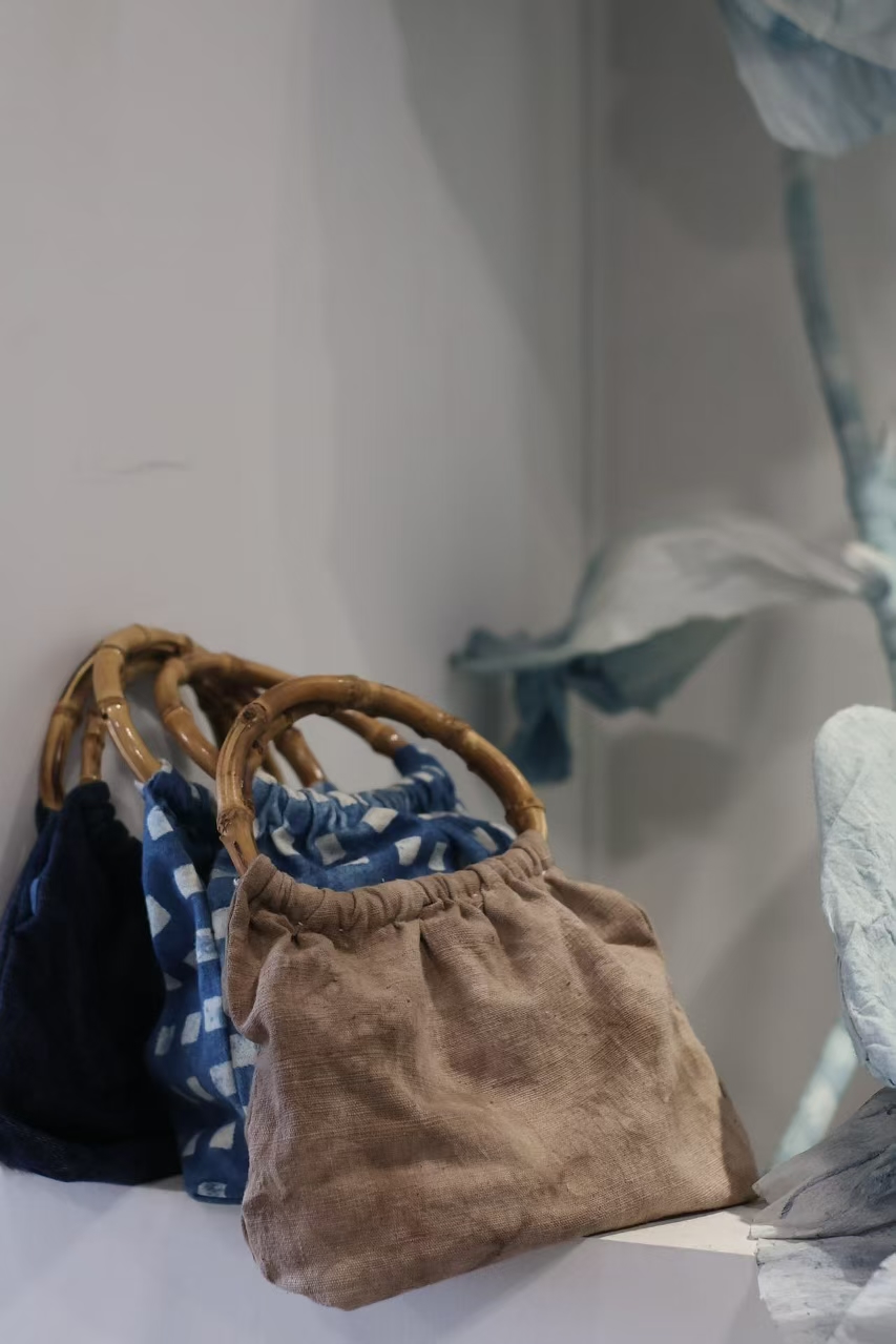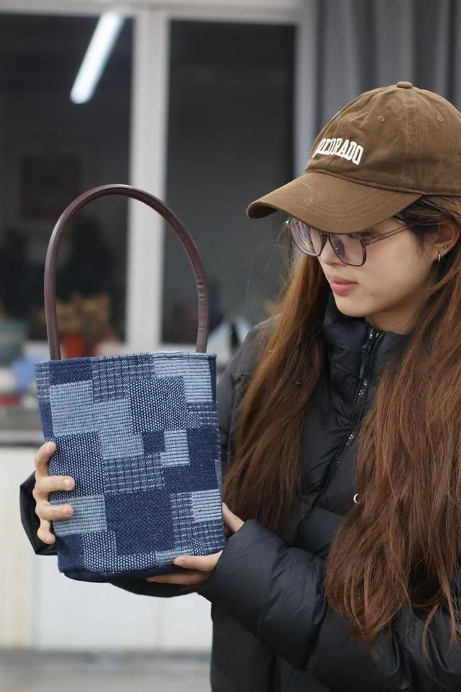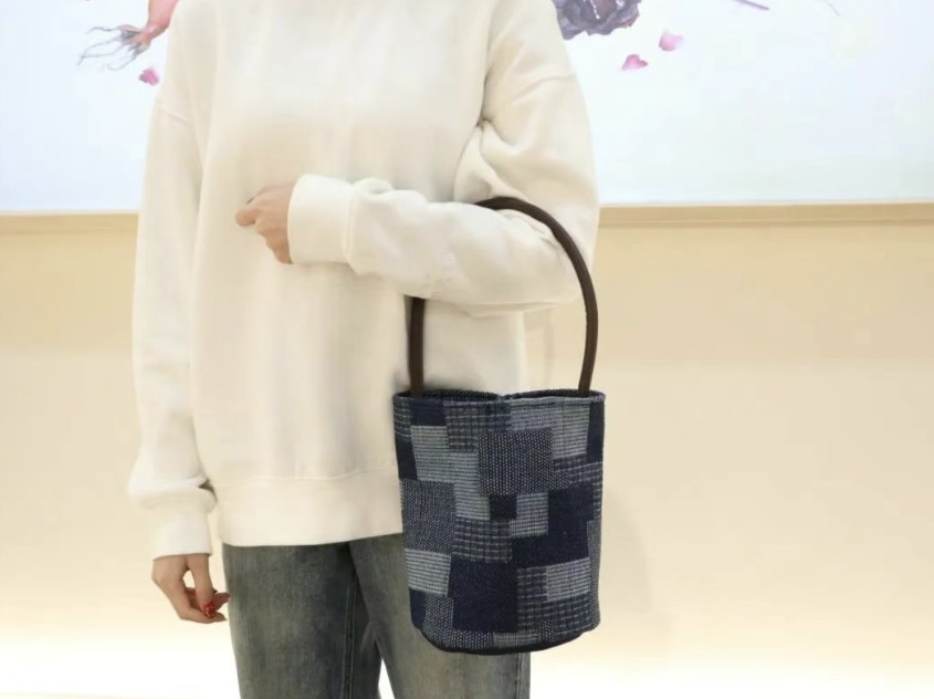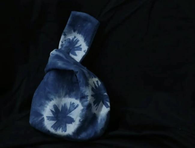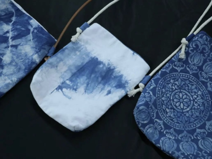 小包運用扎染、印染藍(lán)染工藝,經(jīng)捆綁處理,件件獨一無二。以牛皮繩與包線棉繩作斜挎,長度可調(diào)節(jié),出行裝手機(jī)等隨身物品便捷。
