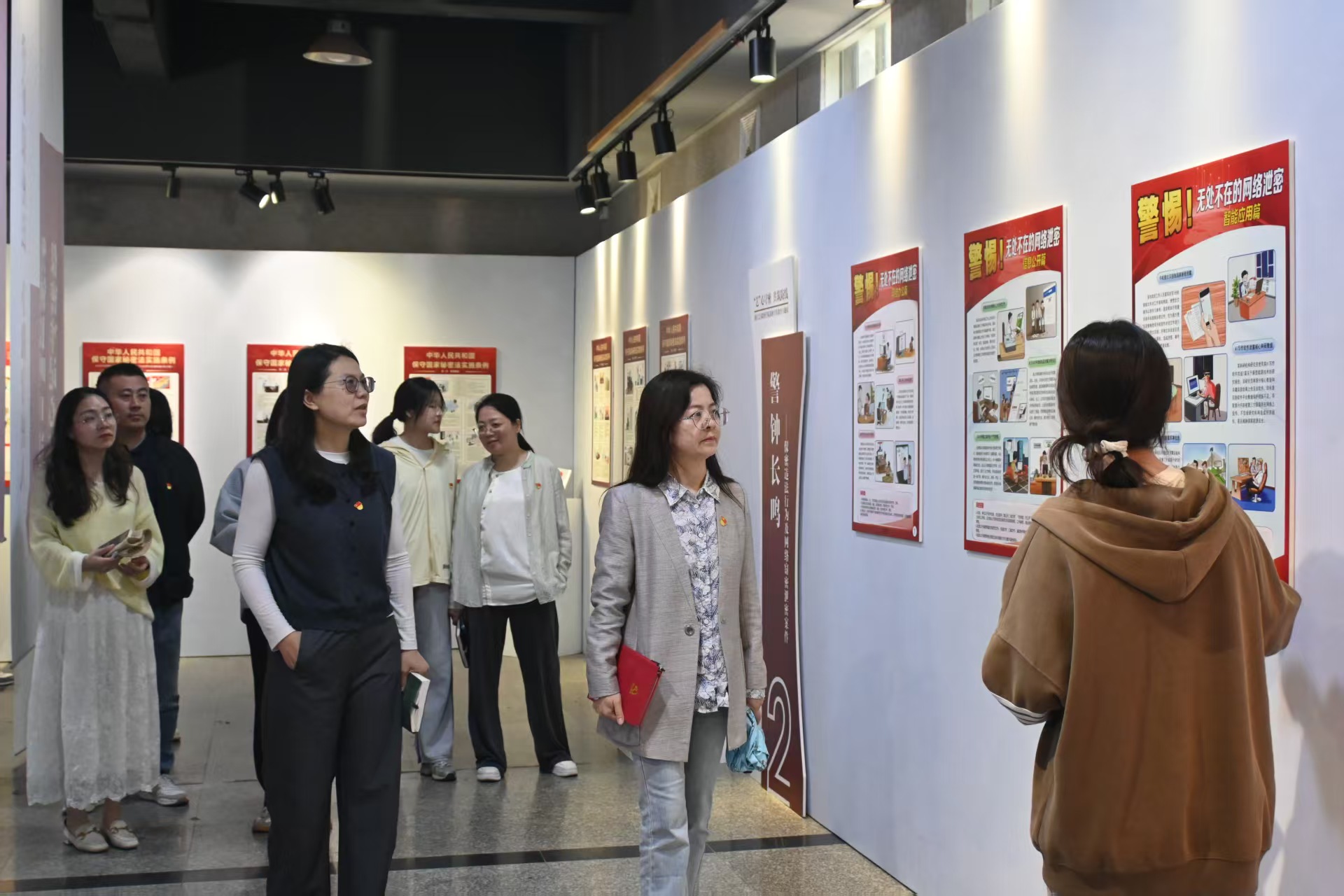 展覽中,師生黨員在講解員的帶領(lǐng)下學(xué)習(xí)了“學(xué)法護(hù)密”“警鐘長(zhǎng)鳴”“防患未然”“視聽(tīng)密語(yǔ)”“‘藝’心守密”“校園筑密”六大主題板塊。