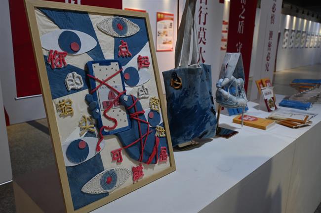 展覽創(chuàng)新融合學(xué)科特色,通過(guò)保密公益宣傳片、公益海報(bào)、扎染等作品,將保密宣傳教育結(jié)合藝術(shù)展陳,詮釋了“專(zhuān)業(yè)+思政”育人理念,彰顯了“共筑保密防線,公民人人有責(zé)”的深刻意蘊(yùn)。