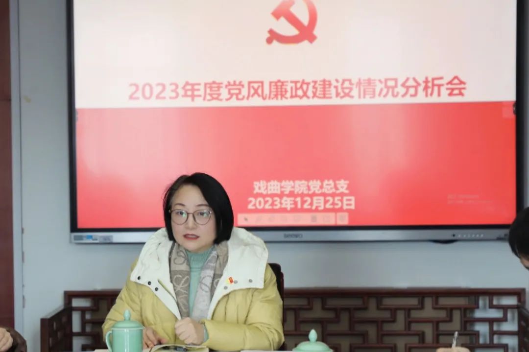 為進一步貫徹落實全面從嚴治黨要求,推進黨風廉政建設,鞏固深化主題教育成果,根據(jù)學校統(tǒng)一部署,12月25日,戲曲學院召開2023年度黨風廉政建設情況分析會。校黨委委員、副校長支濤,戲曲學院領導班子成員,辦公室主任、組織員、黨風廉政建設監(jiān)督員、黨支部書記、教研室主任代表以及校紀委辦公室干事等參加。會議由黨總支書記謝志勇主持。