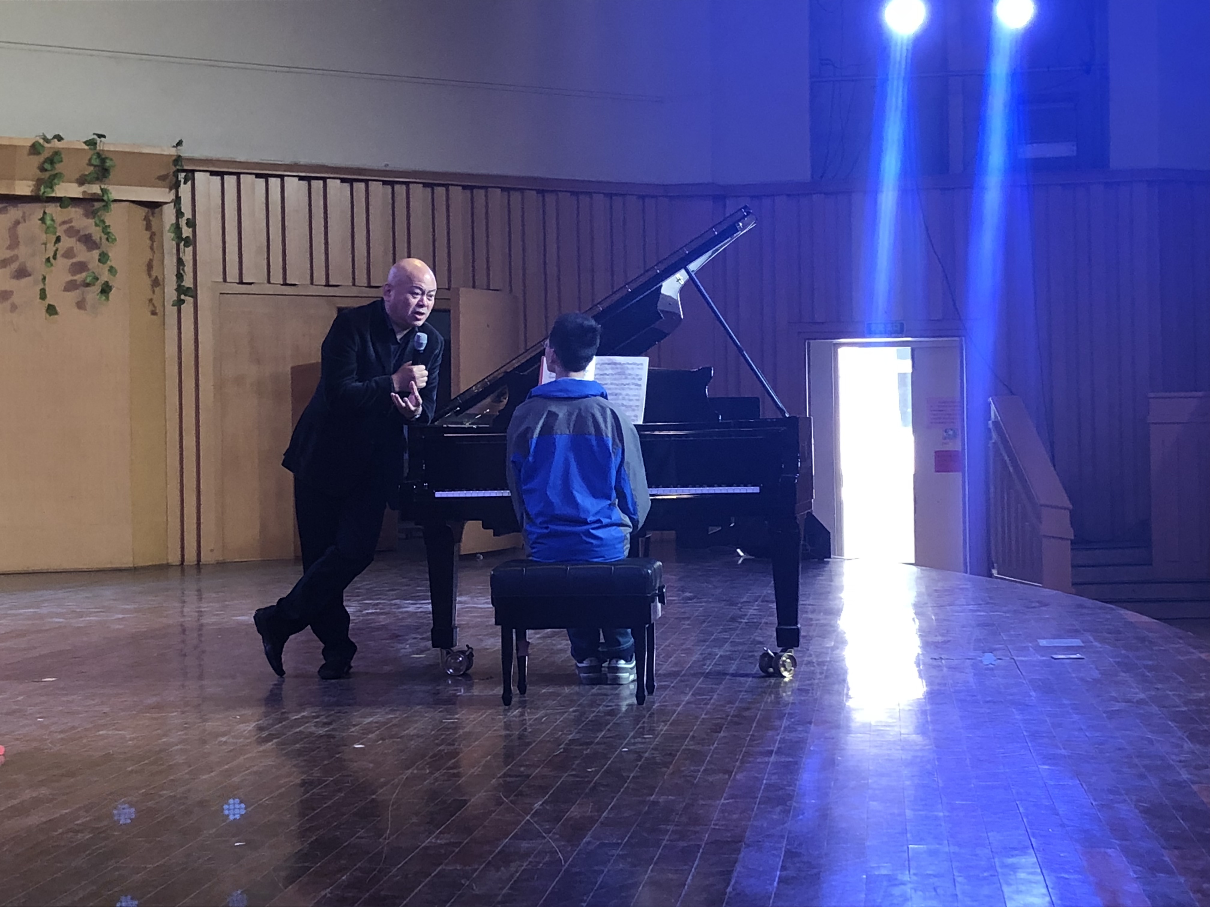 來自16小音樂班李諾舟、16鍵盤一貫班茹則霖、14小音樂班盧涵冰、15鍵盤大專班潘曉潔4名同學(xué)分別上臺演奏了巴赫《平均律》第六首、肖邦《練習(xí)曲》第五首、莫什科夫斯基《練習(xí)曲》第一首和肖邦《練習(xí)曲》第一首共四首曲目,涉及巴洛克和浪漫主義時期的不同流派風(fēng)格。4位同學(xué)時而委婉抒情時而昂揚振奮的演奏收獲了現(xiàn)場觀眾的贊許。徐軍針對4名同學(xué)的表演,分別進行了現(xiàn)場指導(dǎo),尤其是每個人所反映出來的不同問題,予以了建議和修正。當(dāng)遇到言語講解很難令人心領(lǐng)神會的時候,徐軍便直接示范演奏,飛速流動的音符所透出的精湛技藝讓師生們折服。他尤其強調(diào)了鋼琴演奏中顆粒性、力量二者的重要性。為了讓接受指導(dǎo)的同學(xué)更為直觀地理解何為“松弛”狀態(tài)下的正確演奏,他還帶著同學(xué)一起在舞臺上擺出各種體態(tài)姿勢幫助領(lǐng)會,現(xiàn)場互動交流氣氛熱烈。來自14小音樂班盧涵冰同學(xué)是4名同學(xué)中年齡最小的,今年才高一,他的演奏得到了徐軍的高度評價。
