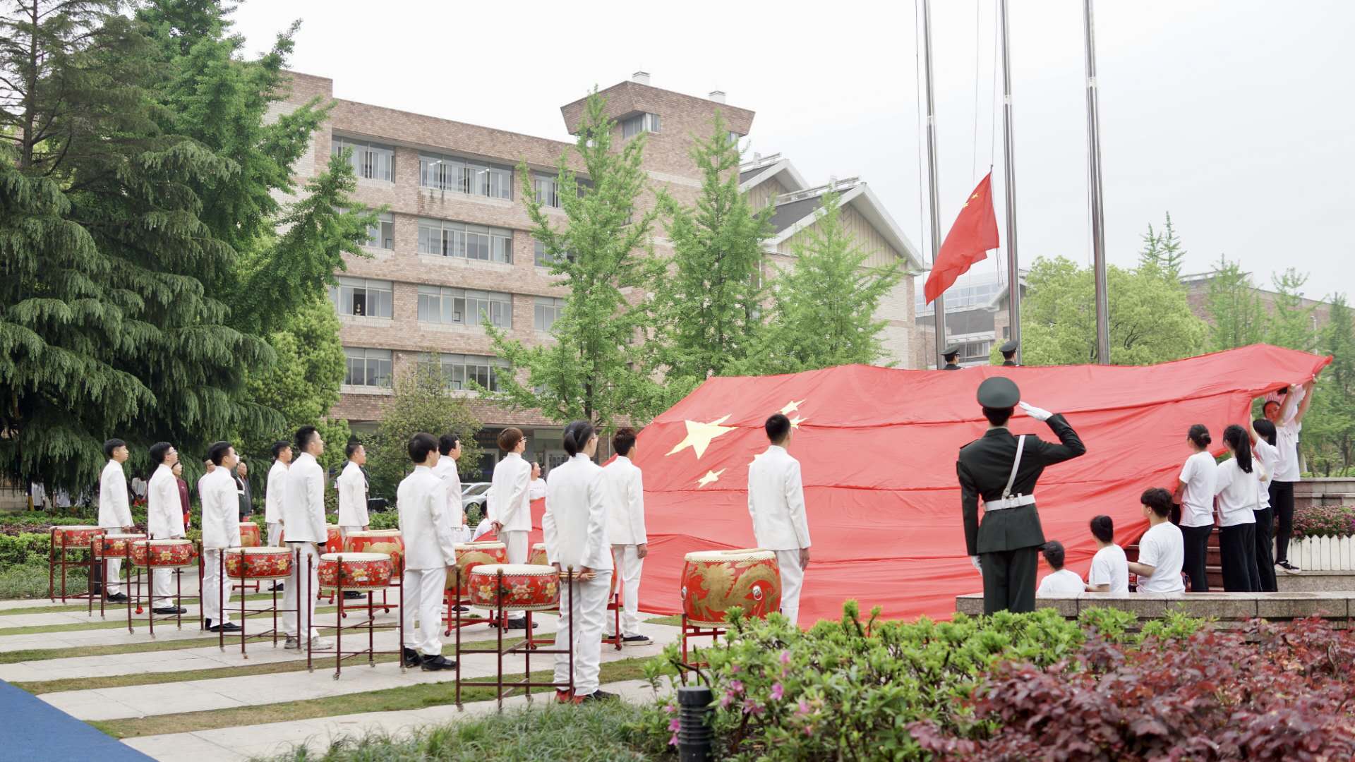 “每當(dāng)義勇軍進(jìn)行曲旋律奏響,每當(dāng)我們仰望五星紅旗冉冉升起,胸中就會(huì)不由自主地涌動(dòng)起激情,升騰起力量。鼓聲激昂、歌聲嘹亮、紅綢飄揚(yáng),那是我們對(duì)偉大祖國(guó)的熱愛、對(duì)偉大時(shí)代的自豪、對(duì)美好明天的希望。”