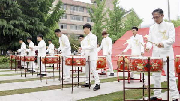 “我和我的祖國(guó),一刻也不能分割,無(wú)論我走到哪里,都流出一首贊歌。我歌唱每一座高山,我歌唱每一條河,裊裊炊煙小小村落,路上一道轍。”在十二面中國(guó)鼓的擂響聲中、在紅綢飄揚(yáng)的舞姿中,全體師生高歌《我和我的祖國(guó)》,用歌聲抒發(fā)對(duì)祖國(guó)的無(wú)限熱愛之情!