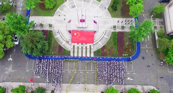 活動(dòng)現(xiàn)場(chǎng),56名歌舞專業(yè)學(xué)生共同舉起國(guó)旗,蘊(yùn)含著56個(gè)民族對(duì)偉大祖國(guó)的熱愛。在廣場(chǎng)正中央,100名聲樂專業(yè)學(xué)生身著黃色外套,排出了“70”的字樣,慶祝新中國(guó)成立70周年、紀(jì)念五四運(yùn)動(dòng)100周年。全體學(xué)生身著白色T恤、深色褲子,在廣場(chǎng)兩側(cè)整齊排列。