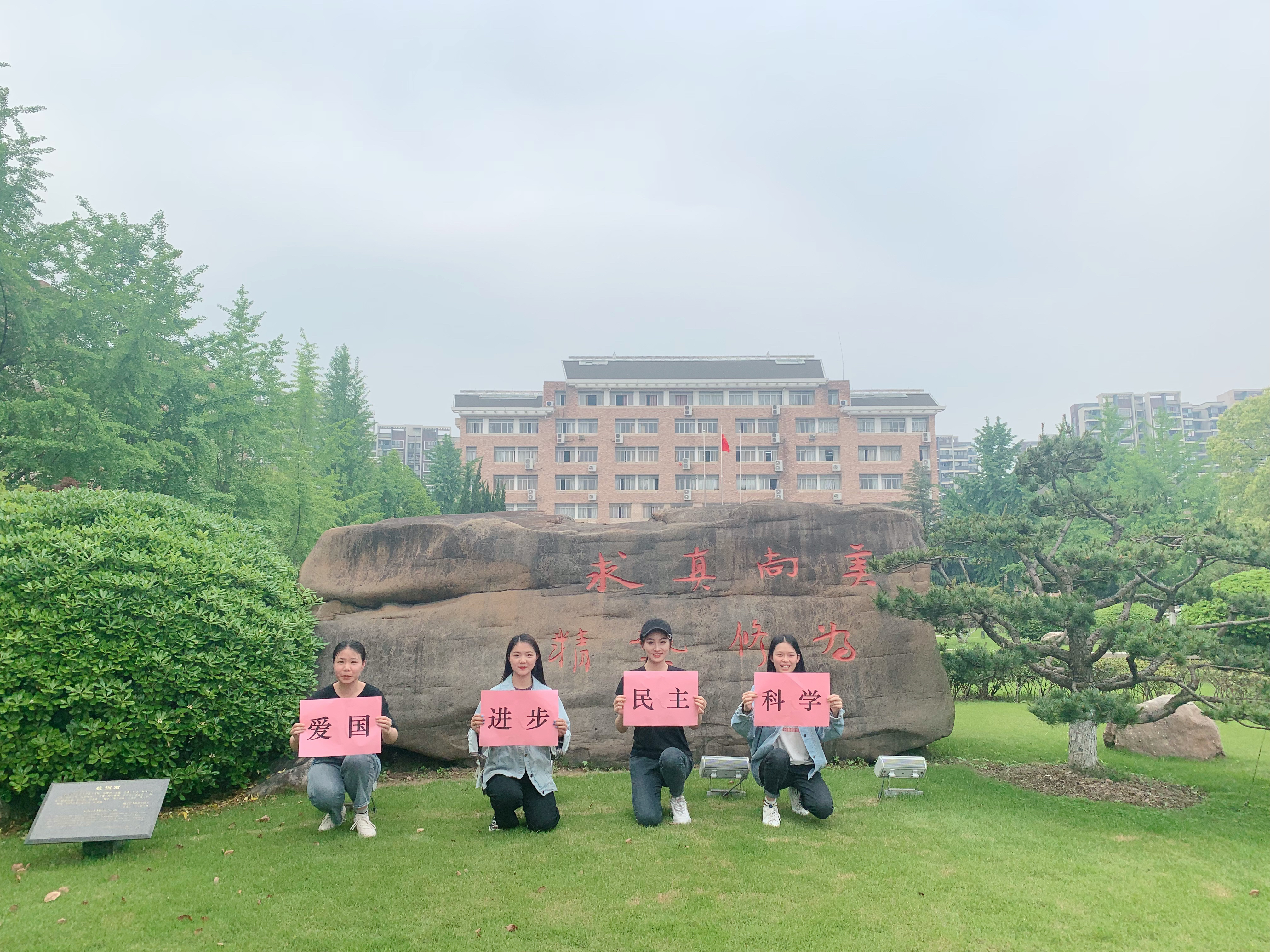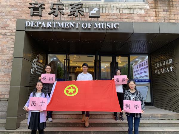 17聲樂(lè)班、第33期音樂(lè)系黨校學(xué)員班分別組織全體成員高舉“愛國(guó)、進(jìn)步、民主、科學(xué)”的五四精神,與國(guó)旗、團(tuán)旗合影留念,在校訓(xùn)石旁留下印記,寫下了“青春心向黨 建功新時(shí)代”的堅(jiān)定初心。