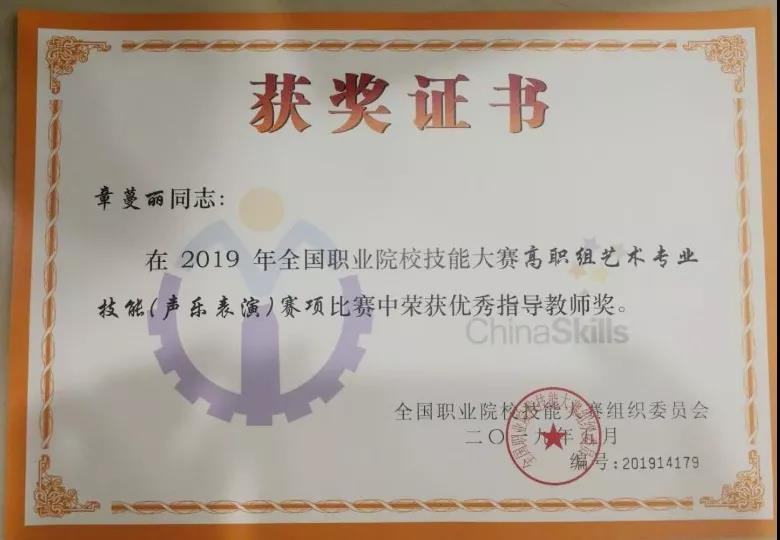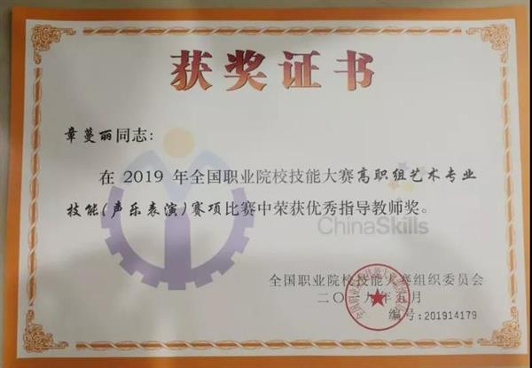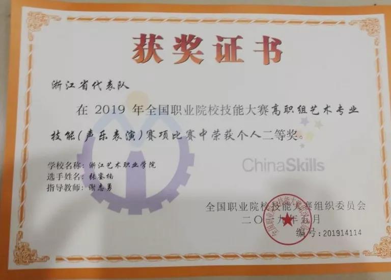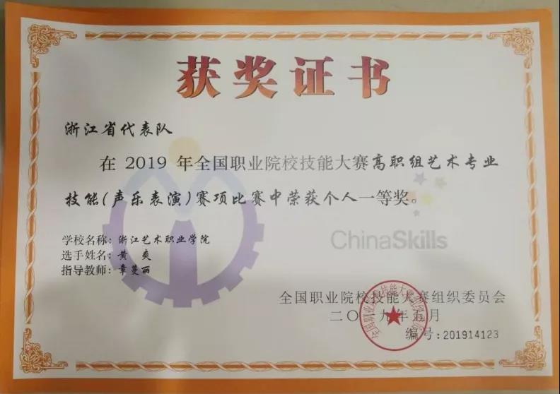 2019年全國(guó)職業(yè)院校技能大賽高職組藝術(shù)專(zhuān)業(yè)技能(聲樂(lè)表演)賽項(xiàng)決賽近日在北京戲曲藝術(shù)職業(yè)學(xué)院舉行,經(jīng)過(guò)兩輪激烈角逐,浙江藝術(shù)職業(yè)學(xué)院音樂(lè)系學(xué)生黃爽以總分第1名的成績(jī)獲民族組一等獎(jiǎng)(指導(dǎo)老師:章蔓麗),張鑾楠以總分第5名的成績(jī)獲民族組二等獎(jiǎng)(指導(dǎo)老師:謝志勇),章蔓麗獲優(yōu)秀指導(dǎo)教師獎(jiǎng)。