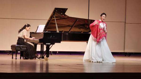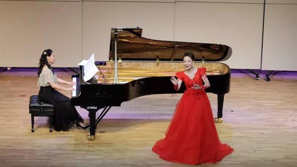 本次大賽期間設(shè)置了教學(xué)交流展示活動(dòng),黃爽有幸受邀在解放軍藝術(shù)學(xué)院教授、女高音歌唱家萬(wàn)山紅所作的講座《聲樂(lè)演唱與舞臺(tái)表演的統(tǒng)一》中擔(dān)任范唱,受到萬(wàn)山紅的肯定和指點(diǎn)。