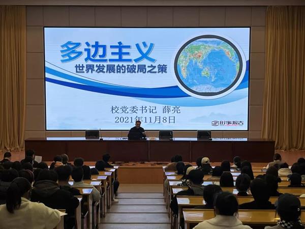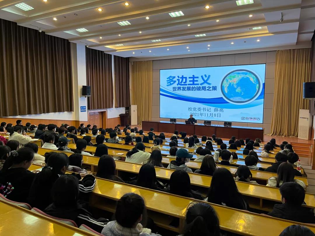 11月8日晚,校黨委書記薛亮應邀在學校圖信中心報告廳以《多邊主義:世界發(fā)展的破局之策》為題,為音樂系師生講授了一堂生動而深刻的形勢與政策課。音樂系領導班子成員、全體思政工作人員、21級高職和本科新生等兩百余人參加。