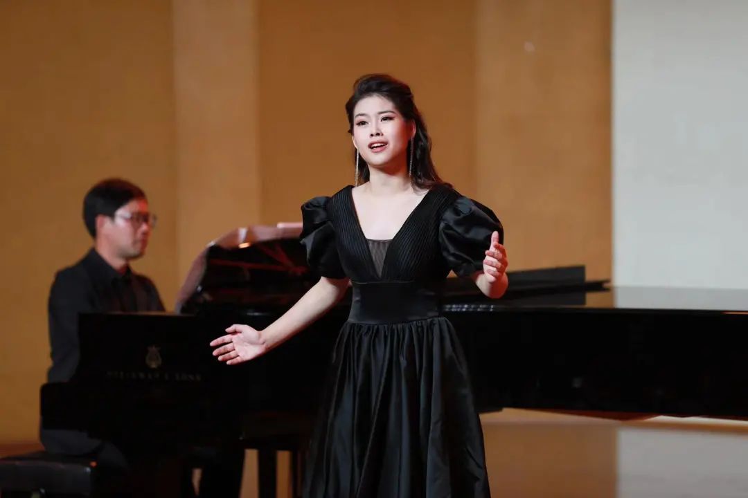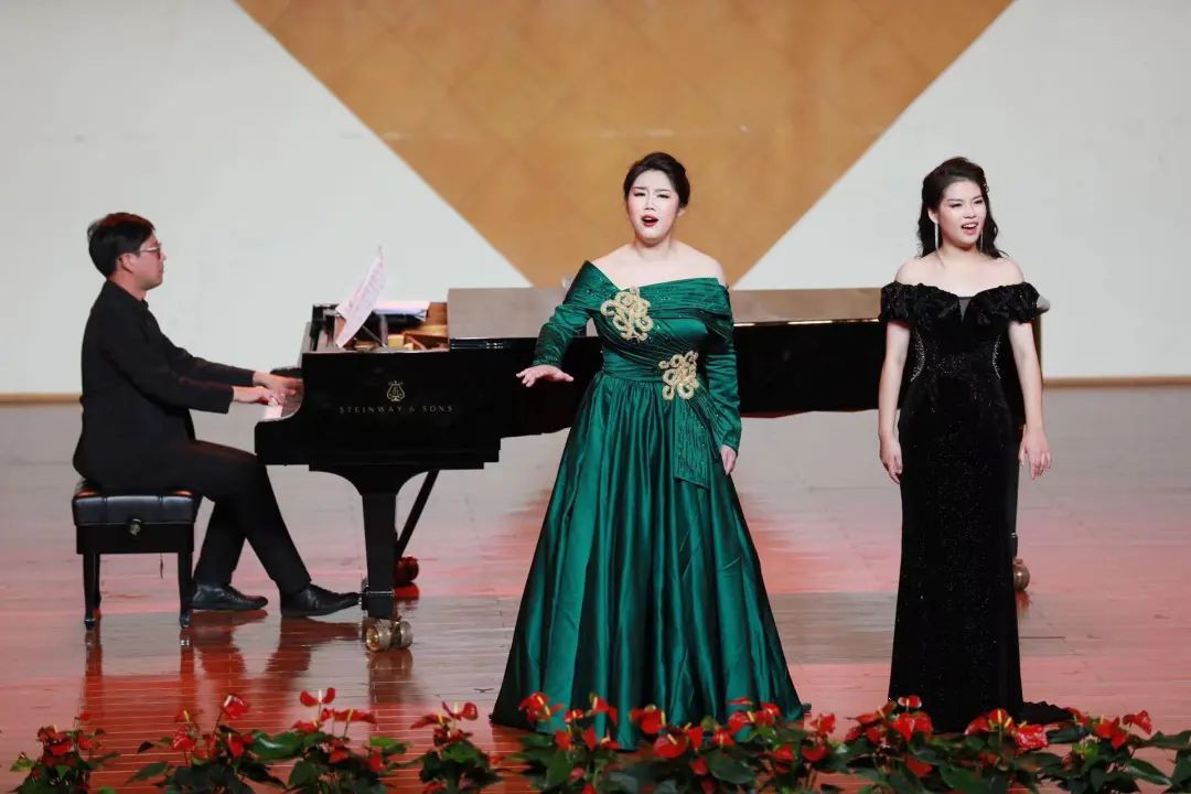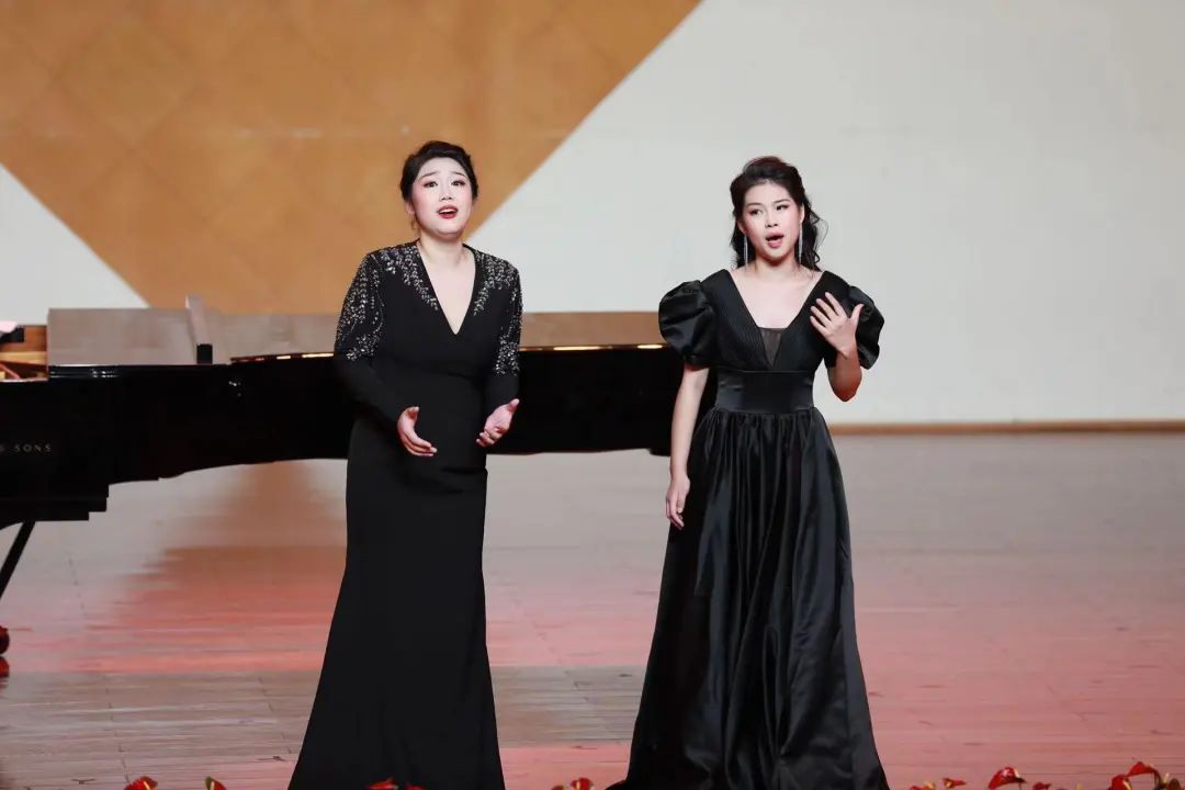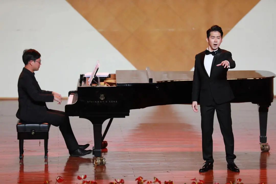 音樂(lè)會(huì)在熱烈的掌聲中拉開帷幕,本場(chǎng)音樂(lè)會(huì)共有十五首曲目,曲目種類豐富、風(fēng)格多樣。兩位同學(xué)以其飽滿的情感、精湛的演唱技巧輔以鋼琴再現(xiàn)了聲樂(lè)藝術(shù)的有聲維度,以及經(jīng)典作品中深厚的中華文化底蘊(yùn),唱出了喜慶二十大,實(shí)現(xiàn)第二個(gè)百年奮斗目標(biāo)的信心和決心。本場(chǎng)音樂(lè)會(huì)特邀青年鋼琴家,音樂(lè)學(xué)院青年教師熊壯壯擔(dān)任藝術(shù)指導(dǎo),特邀青年男中音,音樂(lè)學(xué)院21屆優(yōu)秀畢業(yè)生周余億強(qiáng)擔(dān)任助演嘉賓。兩位學(xué)生的專業(yè)教師朱卓凡登臺(tái)演唱一曲《奇妙的和諧》,為音樂(lè)會(huì)傾情助力。