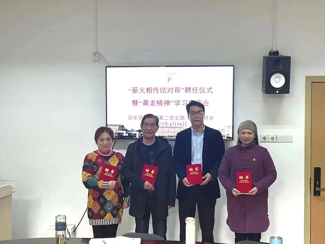 4月18日,音樂學(xué)院教工第二黨支部、民樂教研室在3101黨員之家舉行“薪火相傳結(jié)對(duì)幫”聘任儀式暨“黃龍精神”交流分享。吳樟華、朱學(xué)富、陸曙鳴、馬崊等4位正高職稱黨員教師受聘結(jié)對(duì)4名青年教師,并作“黃龍精神”與教書育人心得分享。支部黨員、民樂教研室全體教師參加。