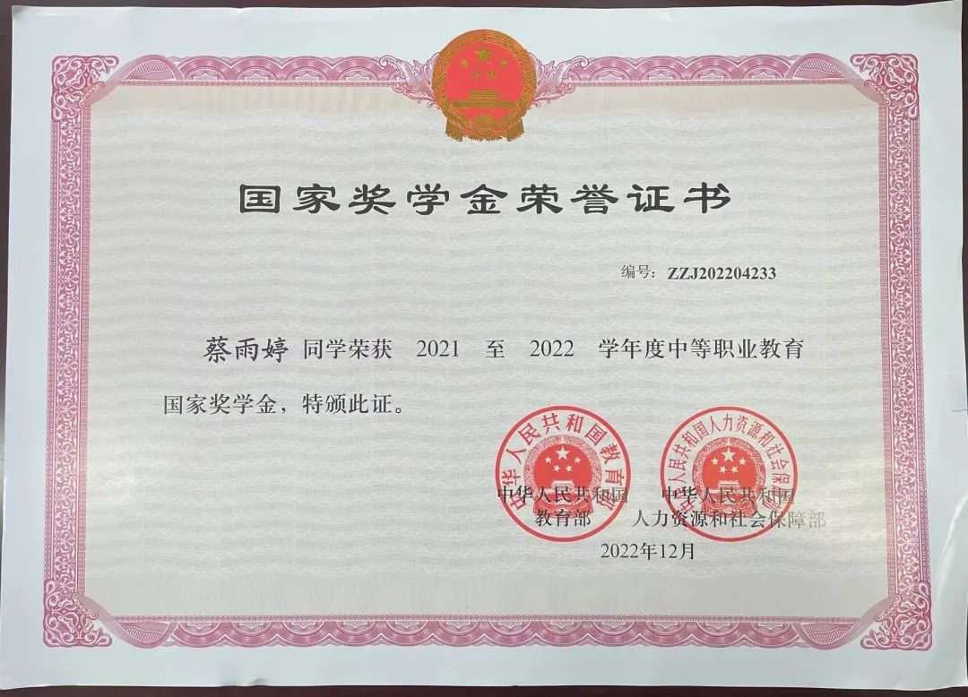 近日,教育部、人力資源社會保障部聯(lián)合發(fā)布《關(guān)于2021—2022學(xué)年度中等職業(yè)教育國家獎學(xué)金獲獎學(xué)生名單的公告》,音樂學(xué)院蔡雨婷、符超杰榜上有名,榮獲“國獎”。