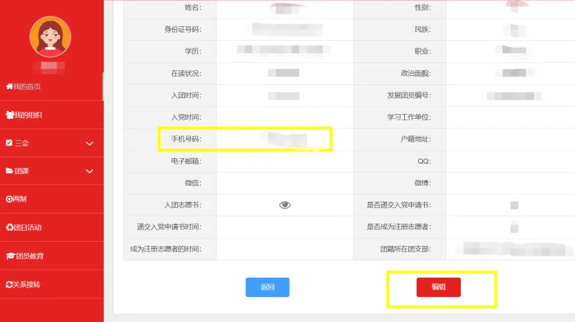 點擊頭像,完善個人信息 手機號碼為必填,若號碼有變動,請及時更改。 【注】:若信息錯誤或有改動,點擊編輯并進行改動。
