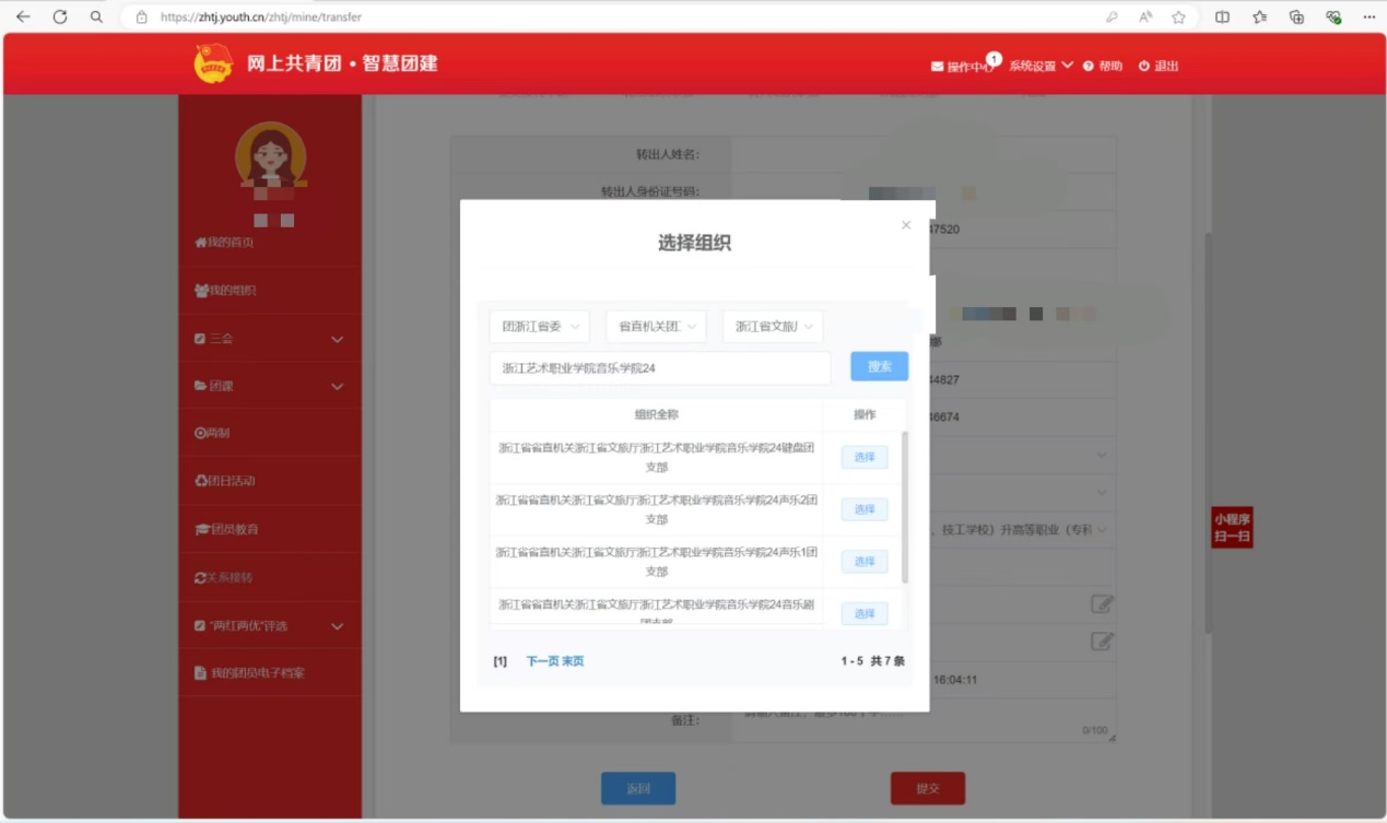 轉入組織:首先選擇“團浙江省委”,其次選擇“省直機關團工委”,而后選擇“浙江省文旅廳”,再輸入“浙江藝術職業(yè)學院音樂學院24”搜索后就會出現(xiàn)你的團支部啦。接下來小萌新們就要根據(jù)自己的班級來選擇自己的團支部