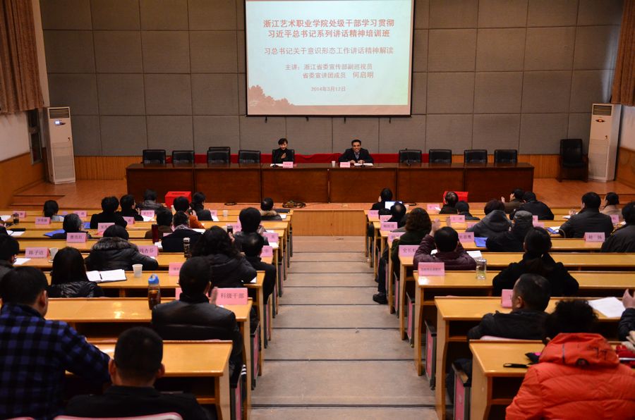 3月12日下午,浙江藝術(shù)職業(yè)學院處級干部學習習近平總書記系列講話精神培訓班邀請浙江省委宣傳部副巡視員、省委宣講團成員何啟明作《習總書記關(guān)于意識形態(tài)工作講話精神解讀》專題講座。黨委副書記黃杭娟主持。學院黨政班子成員和中層處級干部等聽取講座。