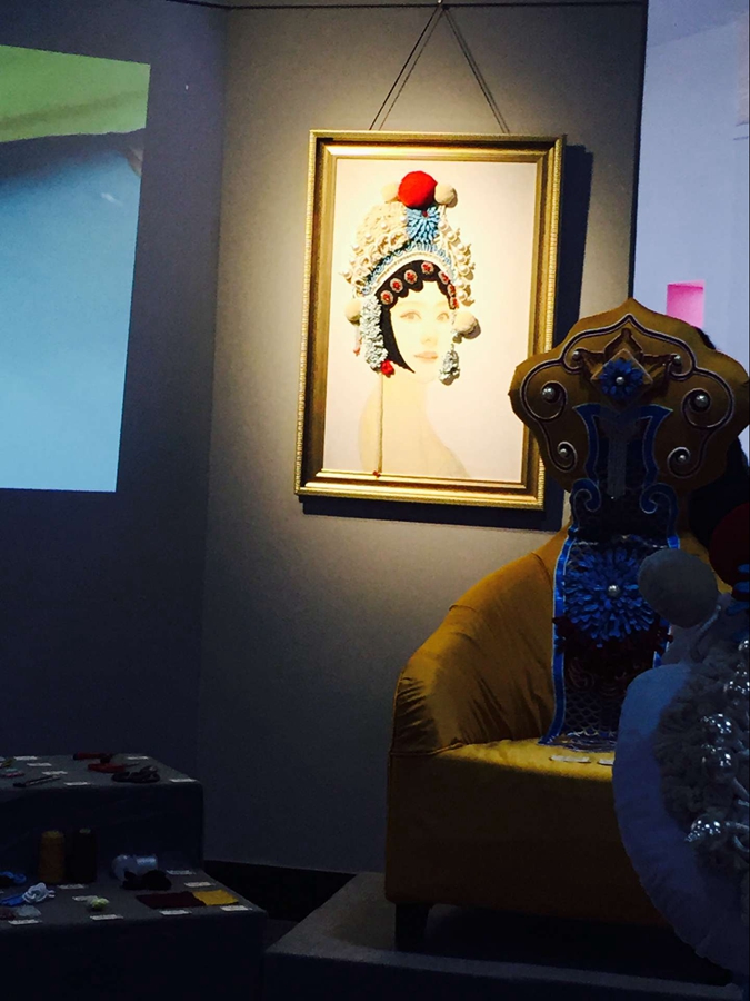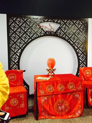 右手邊是昆劇中常見的木頭座椅,套著大紅褂子,褂子上繡的花紋也是極為精細(xì),背后的布景仿的是從前人家的廳堂。轉(zhuǎn)個(gè)身,又看著了一些精美的頭飾和一個(gè)個(gè)樣式各異的座椅,它們后面的墻上掛著兩幅青衣女子的畫像,那帶著妝的美麗模樣叫人好不心生喜歡!墻的中間恰到好處地?cái)[了一塊小銀幕,放映著制作這些小座椅的步驟。