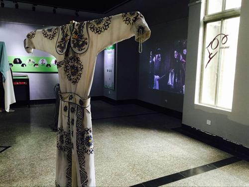 剛進(jìn)門,一套套精致的昆劇戲服就整整齊齊的展現(xiàn)在眼前,金燦尊貴的“龍袍”當(dāng)然最?yuàn)Z人眼球,可我卻獨(dú)愛那一身白的“劍衣”,清爽且利落,我仿佛已經(jīng)看到演繹這位劍客的演員舞著長(zhǎng)劍,著這一身素白時(shí)深邃的眼眸以及如劍一般的黑眉了!