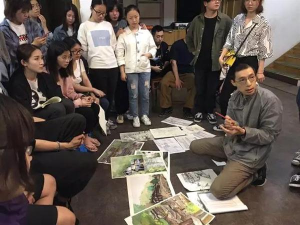 時間回到2017年4月。當(dāng)時肖平擔(dān)任美術(shù)系組織員,負(fù)責(zé)帶領(lǐng)學(xué)生一年兩次外出開展采風(fēng)寫生活動。那次,美術(shù)系師生在浙南溫州的南洞和林坑寫生已連續(xù)三周。老師們白天腳步不停,來來回回地走在學(xué)生寫生的各個點位輔導(dǎo)示范,每天晚上的作業(yè)講評更是認(rèn)真細(xì)致。青年美術(shù)教師陳沁杰每晚都要對當(dāng)日的學(xué)生作品進(jìn)行講解,因為桌子小,他擔(dān)心20多個學(xué)生圍著會看不見,便索性半蹲在地上,一張一張地逐一點評,時間久了,干脆跪著為學(xué)生講解。這樣的情形也許一次兩次無所謂,但是肖平經(jīng)常見到陳老師用這樣的方式為學(xué)生上課,每晚都是從6點半持續(xù)到9點左右。采風(fēng)寫生的周期通常是持續(xù)兩到三周時間,陳沁杰每晚長時間不辭辛勞地蹲著為學(xué)生上課的舉動深深感動了在一旁觀看的肖平。有一天晚上,她拿起相機(jī)默默拍下了這每晚都會上演的感人一幕,溫暖的瞬間被定格了。