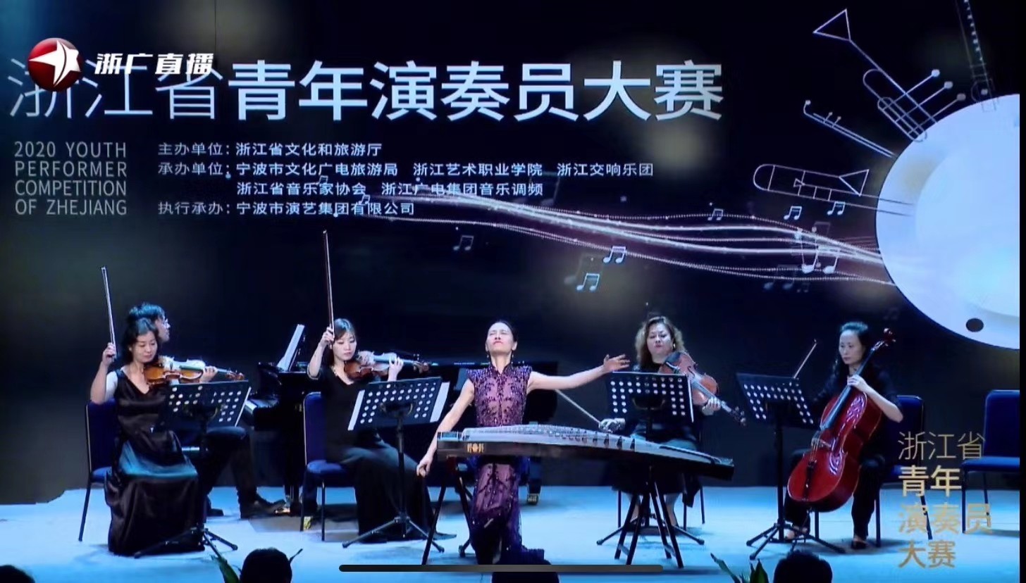 此次比賽參賽曲目都經(jīng)過夏金甌的精心挑選,兼顧了傳統(tǒng)與現(xiàn)代、中國與西方的對比與融合。復(fù)賽曲目是夏金甌向中國音樂學(xué)院青年作曲家陳哲委約的作品《大武》,去年曾在杭州大劇院“春誦夏弦 箏華絕代”夏金甌獨奏音樂會上首次在浙江亮相。決賽曲目夏金甌選擇了浙藝特聘專家、著名作曲家周煜國教授的經(jīng)典箏樂作品《云裳訴》室內(nèi)樂伴奏版本,這首作品如泣如訴的動人旋律感動過每一位聆聽者。周煜國針對此次比賽要求,專門為夏金甌重新在配器上做了調(diào)整,從交響樂版里提取了一些元素,使古箏與室內(nèi)樂這兩種不同文化語境下的聲效,既對比又融合,聽覺更新穎,層次更清晰,一舉在“新松”大賽中獲得一等獎。