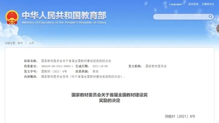 全國教材建設(shè)獎(jiǎng)由國家教材委員會(huì)主辦、教育部承辦,每4年評(píng)選一次,是檢閱、展示教材建設(shè)服務(wù)黨和國家人才培養(yǎng)成果,增強(qiáng)教材工作者榮譽(yù)感、責(zé)任感,推動(dòng)構(gòu)建中國特色、世界水平教材體系的一項(xiàng)重大制度。這是新中國成立以來首次設(shè)立全面覆蓋教材建設(shè)各領(lǐng)域的專門獎(jiǎng)勵(lì)項(xiàng)目,也是全國教材領(lǐng)域的最高獎(jiǎng)。