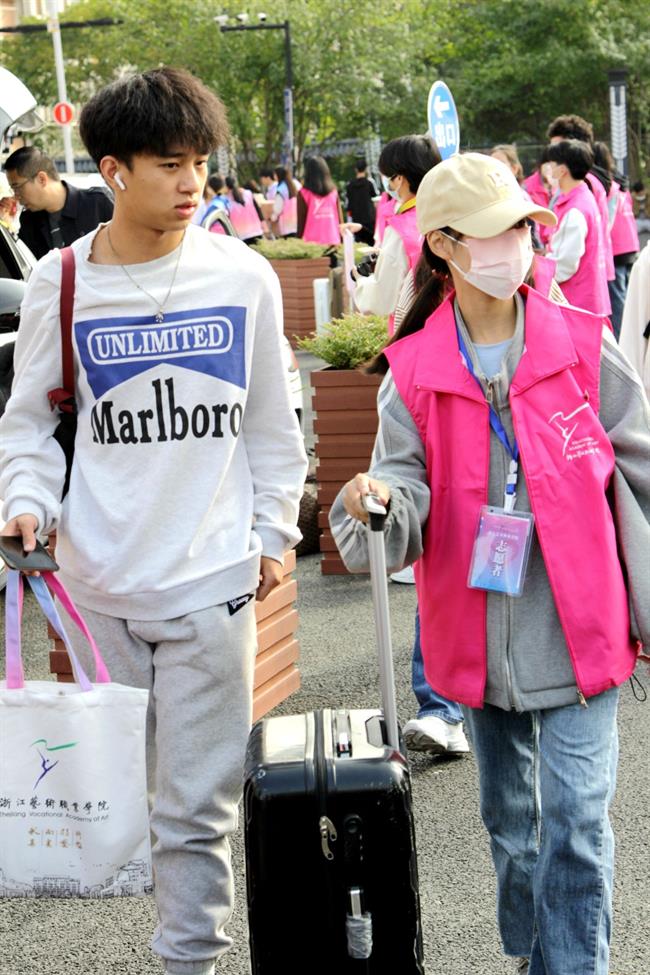 掃碼測(cè)溫、領(lǐng)取材料……一系列報(bào)到工作完成后,新生們正式開啟浙藝之旅。來自義烏的公共文化定向?qū)I(yè)新生朱含蕾,今年高考分?jǐn)?shù)達(dá)到607分。她笑著說:“因?yàn)闊釔鬯囆g(shù),對(duì)文化藝術(shù)有著濃厚的興趣,之前學(xué)習(xí)過相關(guān)藝術(shù)門類,浙藝的專業(yè)很符合我的求學(xué)目標(biāo),希望在接下來的大學(xué)生活中學(xué)好專業(yè)課,積極參加社團(tuán)活動(dòng),度過充實(shí)而有意義的三年。”