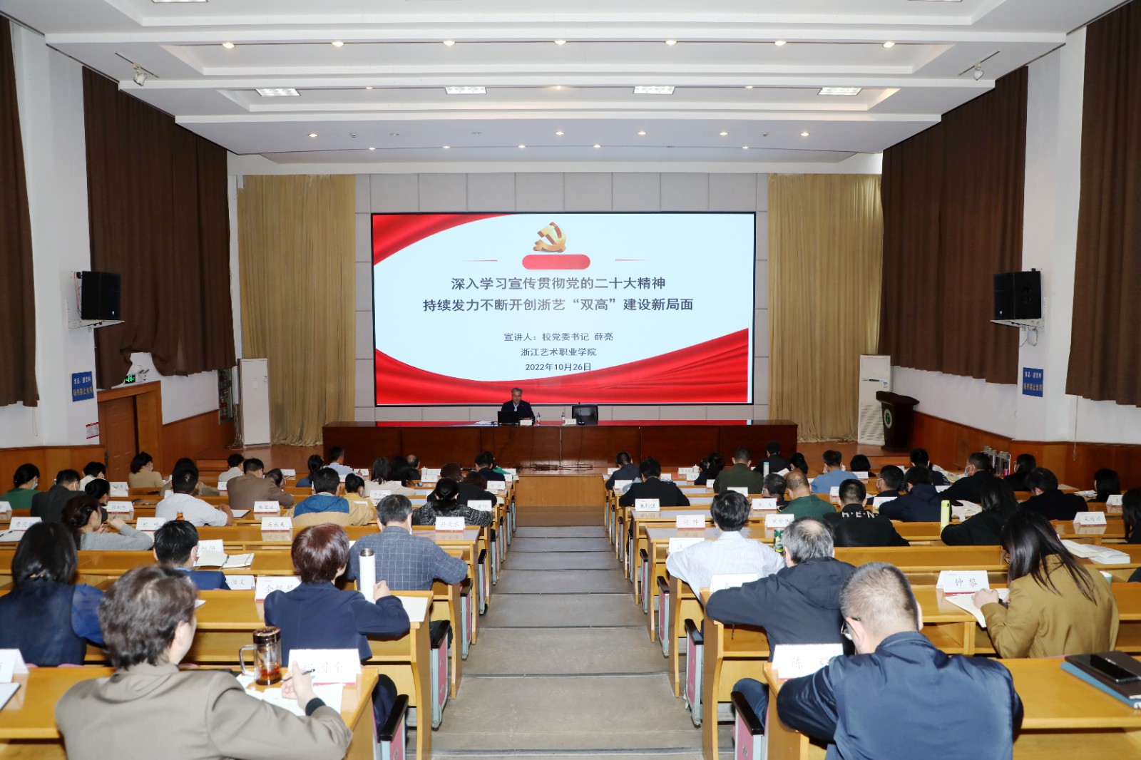 薛亮首先傳達(dá)了省委書(shū)記袁家軍在省委學(xué)習(xí)貫徹黨的二十大精神的領(lǐng)導(dǎo)干部會(huì)議上的講話(huà)精神,接著以宣講員身份傳達(dá)黨的二十大精神。行程萬(wàn)里,山高水長(zhǎng),重任在肩,光明在前。“同志們,萬(wàn)眾矚目、舉國(guó)關(guān)注的中國(guó)共產(chǎn)黨第二十次全國(guó)代表大會(huì)22日在京閉幕,會(huì)議選舉了新一屆的中央領(lǐng)導(dǎo)集體,制定了新征程上黨和國(guó)家事業(yè)發(fā)展的一系列大政方針和戰(zhàn)略部署,全校所有的工作都要緊緊圍繞貫徹二十大精神來(lái)謀劃和開(kāi)展。”薛亮指出,我們要深刻領(lǐng)悟“兩個(gè)確立”的決定性意義,把堅(jiān)決擁護(hù)“兩個(gè)確立”轉(zhuǎn)化為堅(jiān)決做到“兩個(gè)維護(hù)”的實(shí)際行動(dòng),做到“八個(gè)深刻把握”。他號(hào)召全校師生要認(rèn)真學(xué)習(xí)宣傳貫徹黨的二十大精神,將思想和行動(dòng)統(tǒng)一到黨的二十大精神上來(lái),持續(xù)發(fā)力不斷開(kāi)創(chuàng)浙藝“雙高”建設(shè)新局面:一是要迅速掀起學(xué)習(xí)宣傳貫徹黨的二十大精神熱潮。二是要將學(xué)習(xí)宣傳貫徹黨的二十大精神與完成好今年全年工作緊密結(jié)合起來(lái)。三是要通過(guò)學(xué)習(xí)宣傳貫徹黨的二十大精神推動(dòng)學(xué)校“十四五”高質(zhì)量發(fā)展。