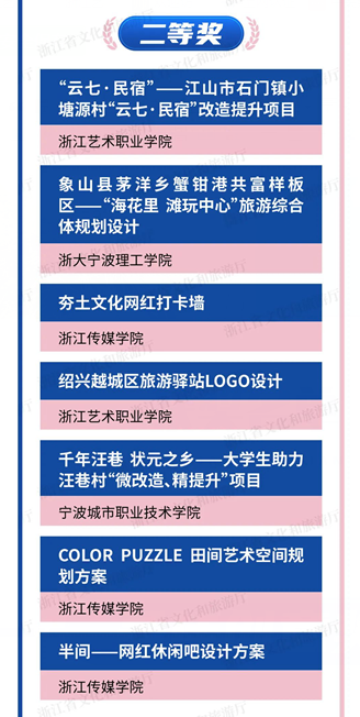 本次大賽是深入貫徹浙江省旅游業(yè)“微改造、精提升”五年行動(dòng)計(jì)劃的生動(dòng)實(shí)踐,讓高校師生成為助力浙江旅游業(yè)高質(zhì)量發(fā)展的新生力量,助力實(shí)現(xiàn)“席地而坐,悅心而游”。自今年6月大賽啟動(dòng)以來(lái),共征集到22所高校共81組參賽作品。經(jīng)過角逐,首屆浙江省大學(xué)生助力旅游業(yè)“微改造、精提升”創(chuàng)意策劃大賽最終產(chǎn)生一等獎(jiǎng)4個(gè),二等獎(jiǎng)7個(gè),最佳創(chuàng)意獎(jiǎng)1個(gè),最佳策劃獎(jiǎng)1個(gè),同時(shí)公布了10個(gè)三等獎(jiǎng)、10個(gè)優(yōu)秀獎(jiǎng)和5個(gè)最佳組織獎(jiǎng)名單。