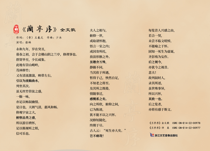 據(jù)悉,該作品于1991年動筆,2001年成稿,2013年完成音響錄音制作,經(jīng)歷十多年沉浸、傳唱和修改,終于在今年11月正式出版。創(chuàng)作該作品的初衷,緣自盧竹音學習《蘭亭集序》書法時,萌發(fā)用音樂表達其內(nèi)容和情感的念頭。由于序文較長,駢體風格,對偶排比,內(nèi)容無故事性鏈接,在譜曲中遇到諸多困難。盧竹音克服種種困難,邊采風邊寫作邊征求意見,不斷修改完善。為了獲得自然環(huán)境的體驗,盧竹音利用各種機會先后十多次到紹興蘭亭“曲水流觴”尋找音樂形象和心靈感覺,日暮間常思常想,尋唱句在生活的每一處。歷經(jīng)十多年探索,終于完成譜曲。張琳的充滿韻味的吟唱,于曲調婉轉間,有一種微妙的人和大自然融合在一起的境界。聽眾仿佛置身于“祟山峻嶺、茂林修竹”之間,閉上眼就能夠觀覽到宇宙的浩大,俯看大地眾多的萬物。歌曲層層遞進之時,使人愈加能夠感受到盧竹音傾注于此的心血。王羲之與友⼈會聚蘭亭,賦詩飲酒,但天下沒有不散的宴席,有聚合必有別離;盧竹音已退休多年,心中仍有對音樂的向往和執(zhí)著的熱情。《蘭亭集序》在2020年5月被選為首批“浙江文化印記”,《蘭亭序全文歌》的出版問世,將進一步促進《蘭亭集序》的傳播傳承,煥發(fā)新的生命力,愿《蘭亭集序》憑此曲飛入尋常百姓間。