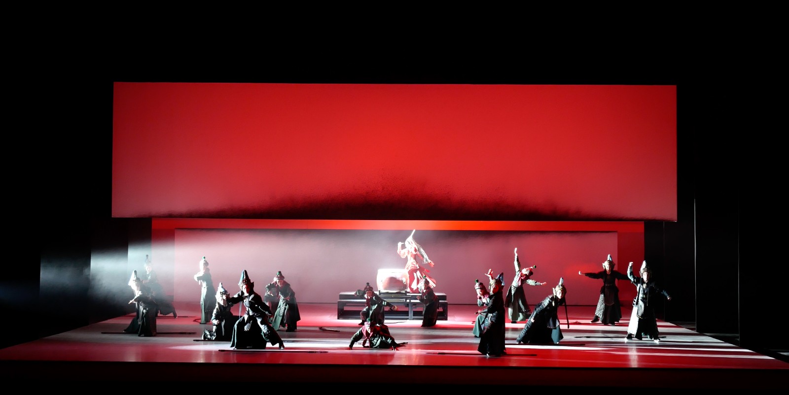 《紅玉》舞臺美術(shù)主體結(jié)構(gòu)是一塊幾乎可以撐滿臺口的15x6米的活動硬景片裝置,沿著底邊繪有濺開的墨線,隨著劇情發(fā)