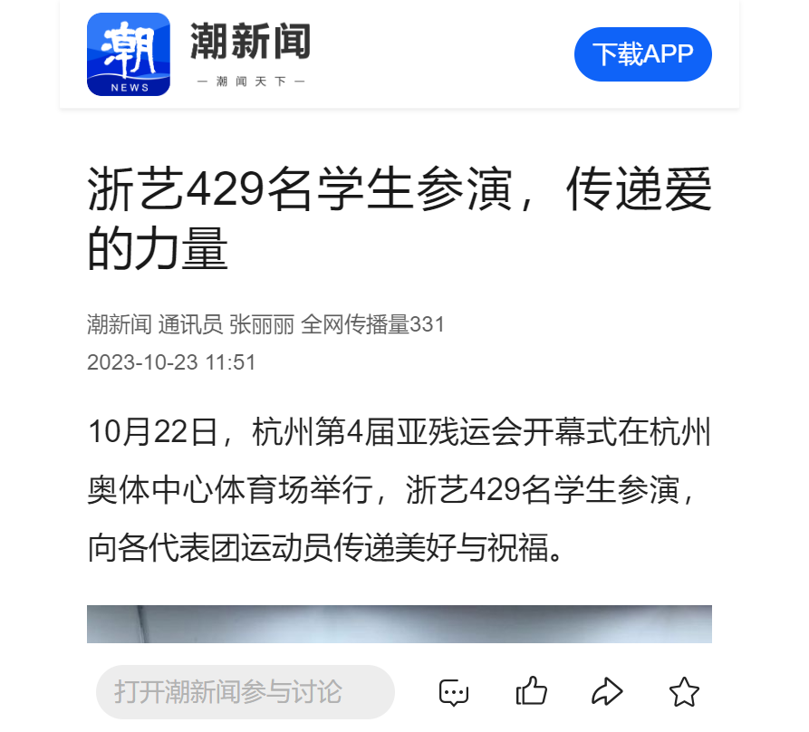 10月22日,杭州第4屆亞殘運會開幕式在杭州奧體中心體育場舉行,浙藝429名學(xué)生參演,向各代表團運動員傳遞美好與祝福。