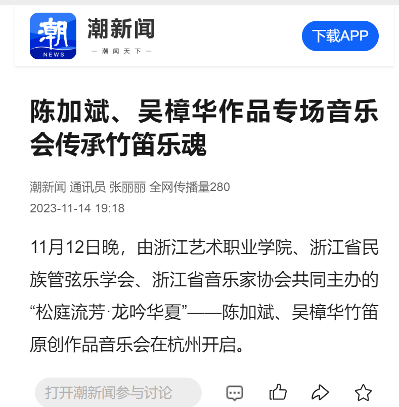 潮新聞:陳加斌、吳樟華作品專場(chǎng)音樂(lè)會(huì)傳承竹笛樂(lè)魂