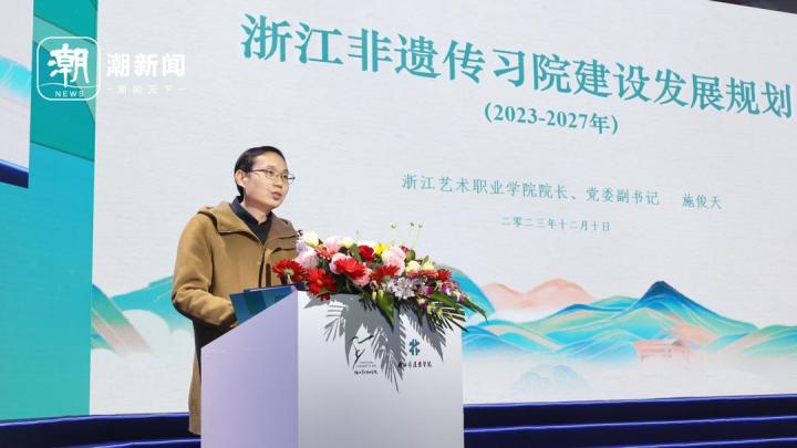 浙江藝術(shù)職業(yè)學(xué)院黨委副書(shū)記、院長(zhǎng)施俊天現(xiàn)場(chǎng)發(fā)布浙江非遺傳習(xí)院(籌)五年規(guī)劃。