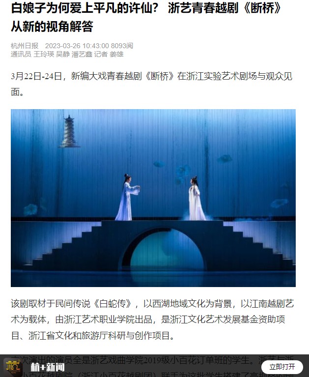 杭州日?qǐng)?bào):白娘子為何愛上平凡的許仙? 浙藝青春越劇《斷橋》從新的視角解答