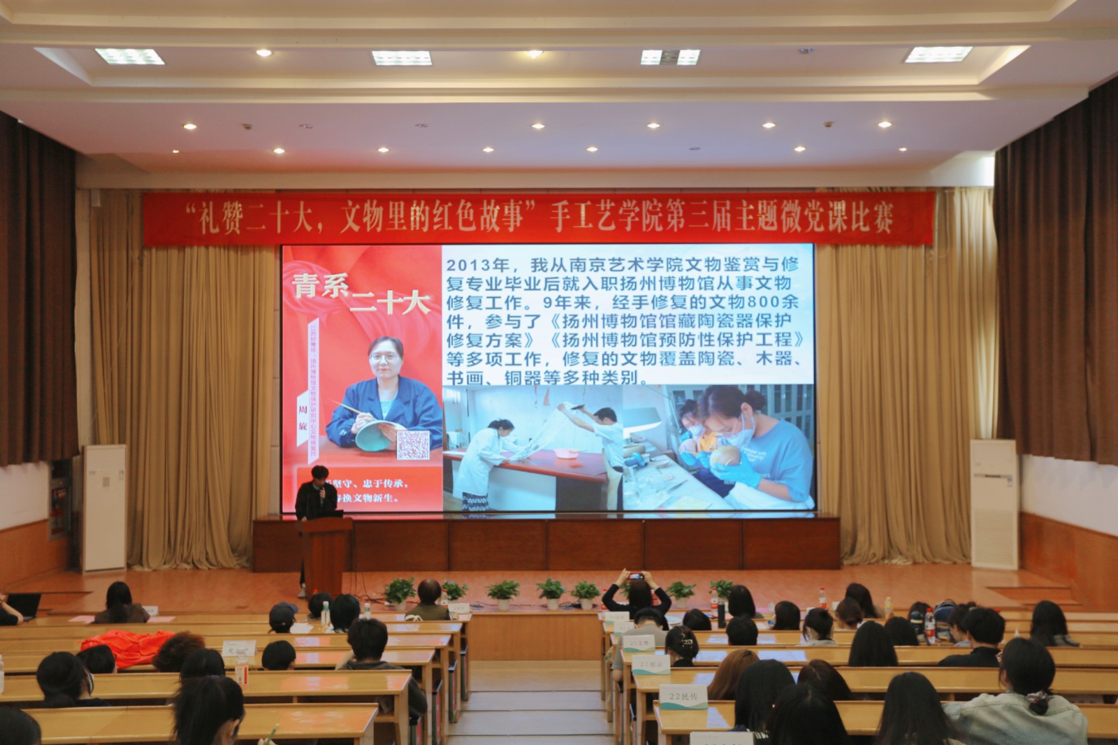 為學習貫徹落實黨的二十大精神,用故事承載手藝精神,以文物講述紅色記憶,4月12日中午,手工藝學院在圖信報告廳舉辦“禮贊二十大,文物里的紅色故事”第三屆主題微黨課比賽。來自不同專業(yè)的十名參賽選手為大家?guī)砹司实奈Ⅻh課。