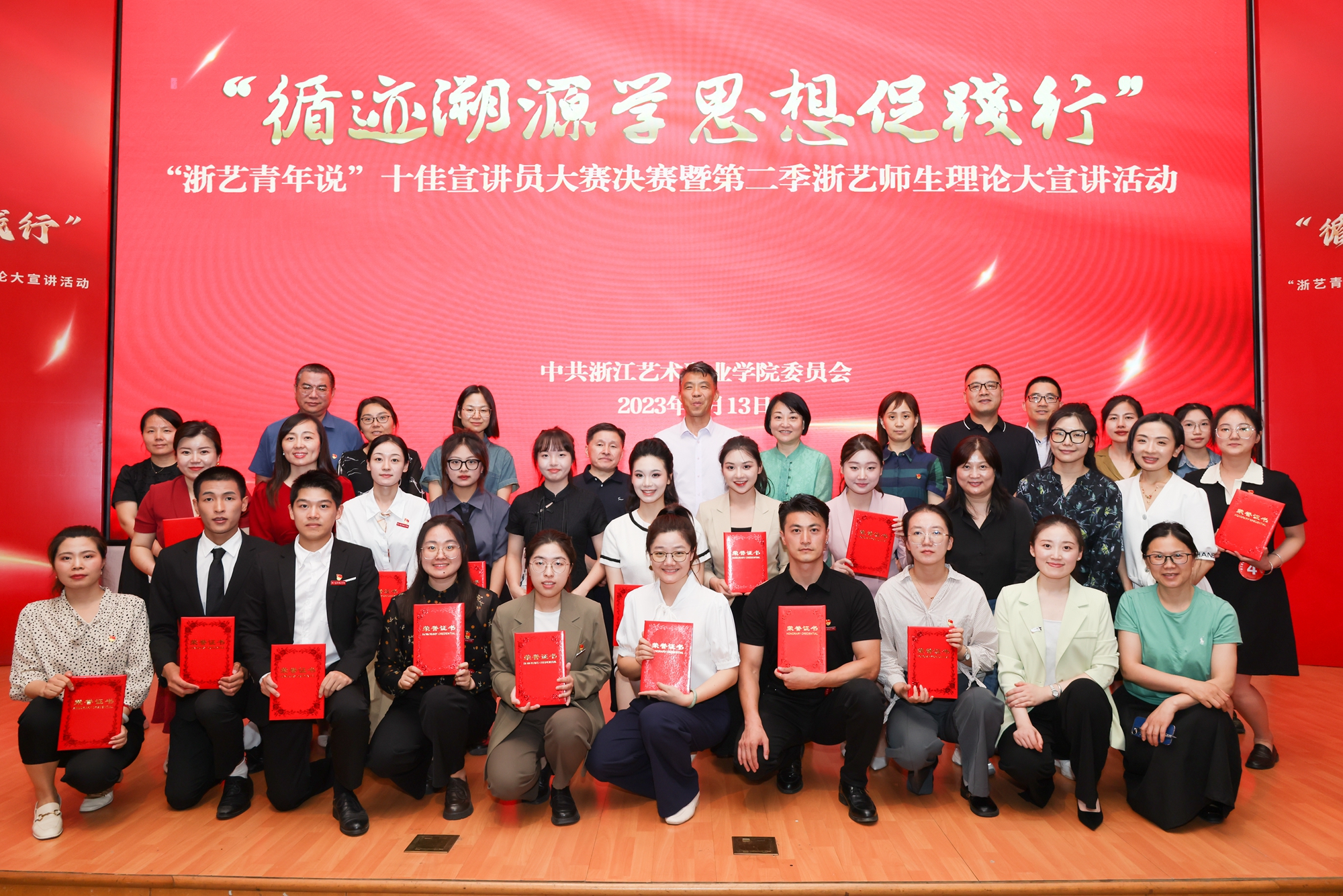 校黨委委員、副院長沈軍甫,黨委委員、副院長支濤為“浙藝青年說”十佳宣講員稱號獲得者頒獎