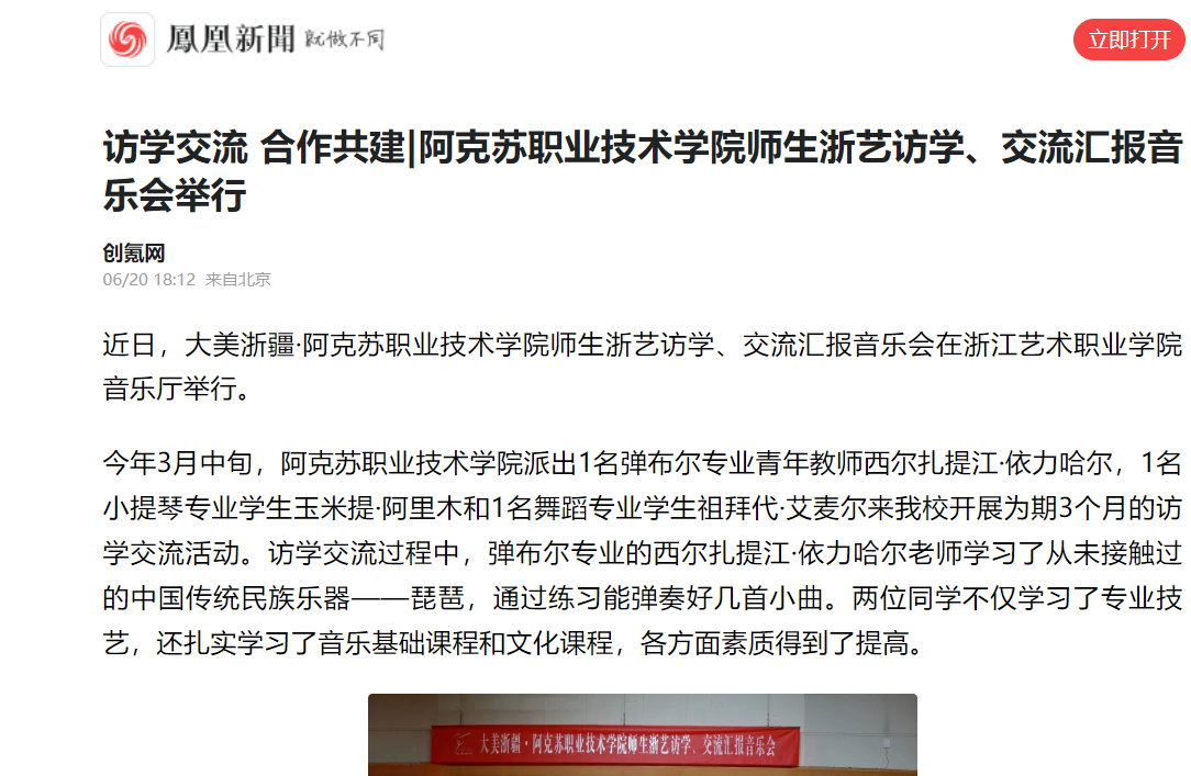 鳳凰新聞:訪學(xué)交流 合作共建|阿克蘇職業(yè)技術(shù)學(xué)院師生浙藝訪學(xué)、交流匯報(bào)音樂(lè)會(huì)舉行