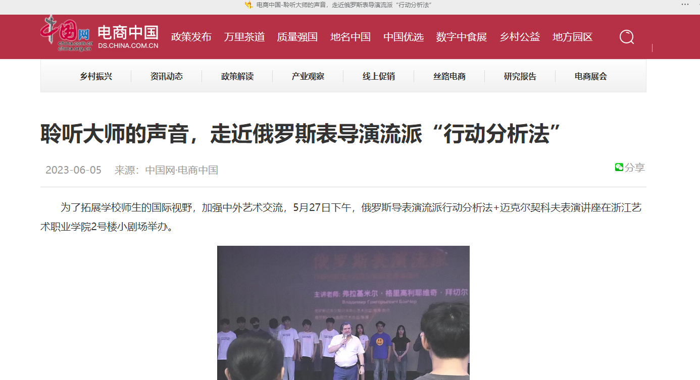 為了拓展學(xué)校師生的國際視野,加強(qiáng)中外藝術(shù)交流,5月27日下午,俄羅斯導(dǎo)表演流派行動(dòng)分析法+邁克爾契科夫表演講座在浙江藝術(shù)職業(yè)學(xué)院2號樓小劇場舉辦。