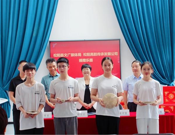 松陽(yáng)縣文廣旅體局副局長(zhǎng)徐偉鋒代表松陽(yáng)縣文廣旅體局以及下轄松陽(yáng)高腔傳承發(fā)展公司為學(xué)生代表贈(zèng)送了教學(xué)樂(lè)器。