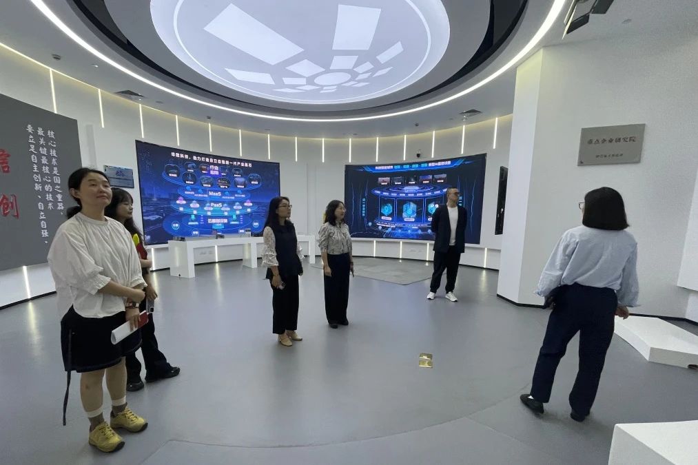 學(xué)院一行人在浙江華數(shù)文化產(chǎn)業(yè)發(fā)展有限公司企業(yè)負責(zé)人王楨臻的帶領(lǐng)下參觀了華數(shù)集團5G智能展廳,詳細了解企業(yè)發(fā)展歷程。