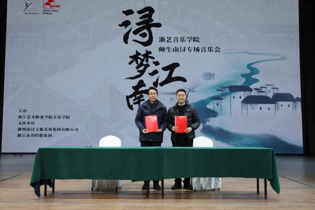 此次音樂(lè)會(huì)是音樂(lè)學(xué)院在積極響應(yīng)《國(guó)家職業(yè)教育實(shí)施改革方案》和學(xué)校高質(zhì)量發(fā)展內(nèi)涵關(guān)于文旅融合、產(chǎn)教融合、校企合作方向上所開(kāi)展的一項(xiàng)具體舉措。此前,經(jīng)過(guò)前期調(diào)研和溝通商議,浙江藝術(shù)職業(yè)學(xué)院音樂(lè)學(xué)院與湖州南潯文旅發(fā)展集團(tuán)有限公司達(dá)成校企合作意向,雙方約定共同對(duì)南潯古鎮(zhèn)的文化內(nèi)涵進(jìn)行深度挖掘,通過(guò)專場(chǎng)音樂(lè)會(huì)、音樂(lè)劇、音樂(lè)節(jié)等形式,探索校企合作的新模式,共同打造符合南潯特色的文化標(biāo)識(shí)。音樂(lè)會(huì)上,吳樟華、陳毅與湖州南潯文旅發(fā)展集團(tuán)有限公司副總經(jīng)理褚夏亮、副總經(jīng)理丁建強(qiáng)分別就“校企合作”和“黨建共建”簽訂合作共建協(xié)議。