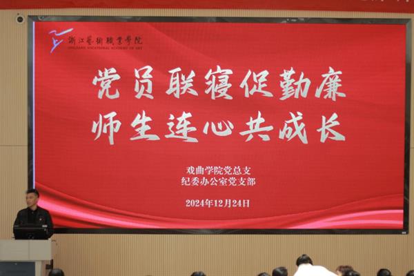 12月24日中午,戲曲學(xué)院黨總支與紀(jì)委辦公室黨支部聯(lián)合舉辦了“黨員聯(lián)寢促勤廉,師生連心共成長”黨員聯(lián)系寢室活動。校黨委委員、紀(jì)委書記沈軍甫,校紀(jì)委辦公室、戲曲學(xué)院全體黨員和近300名戲曲學(xué)子共同參與。活動由戲曲學(xué)院黨總支書記謝志勇主持。