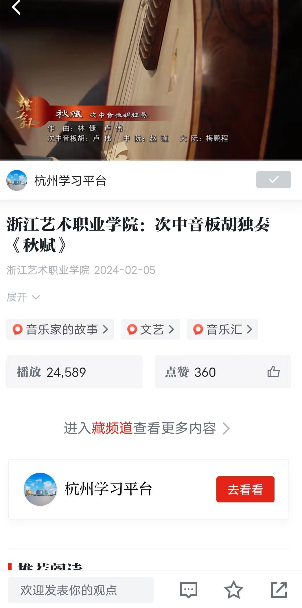 學(xué)習(xí)強(qiáng)國全國平臺(tái):浙江藝術(shù)職業(yè)學(xué)院:次中音板胡獨(dú)奏《秋賦》