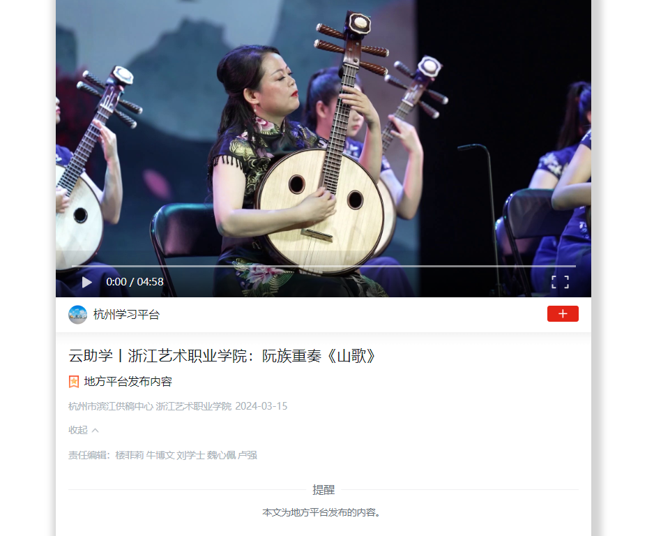 學(xué)習(xí)強(qiáng)國(guó)杭州平臺(tái):云助學(xué)丨浙江藝術(shù)職業(yè)學(xué)院:阮族重奏《山歌》
