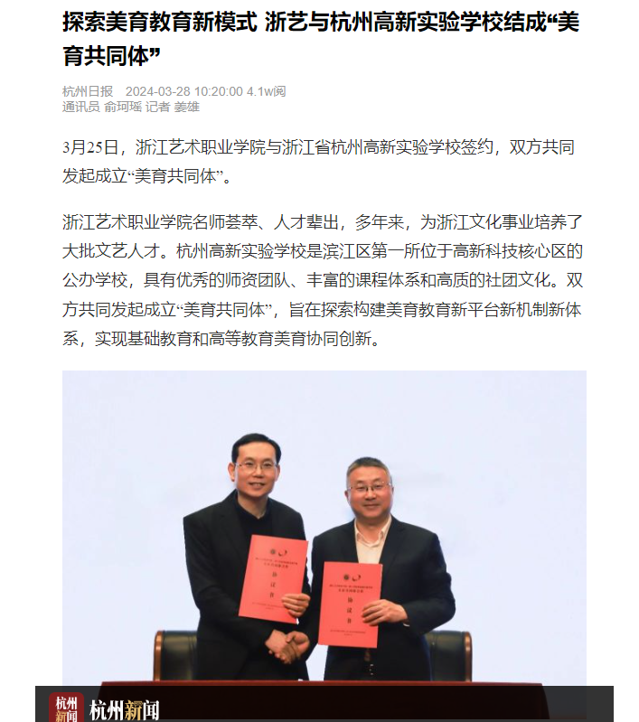 3月25日,浙江藝術(shù)職業(yè)學(xué)院與浙江省杭州高新實驗學(xué)校簽約,雙方共同發(fā)起成立“美育共同體”。