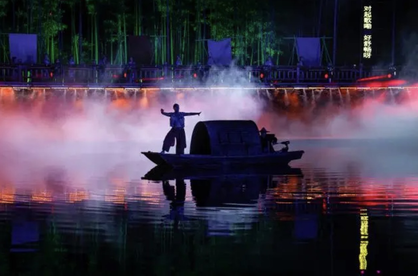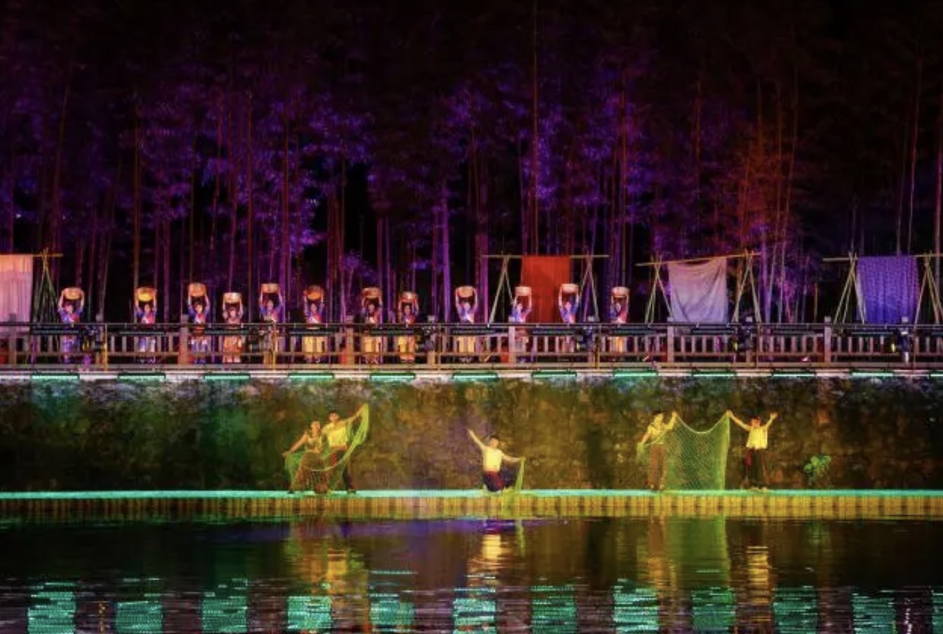 整場(chǎng)演出全部由48位村民完成,包含原生態(tài)行為藝術(shù)、情景原生態(tài)對(duì)歌、女子舞蹈、水陸音樂(lè)節(jié)和歌舞表演等多種演出形式,演出團(tuán)隊(duì)將原生態(tài)鄉(xiāng)村生活與現(xiàn)代藝術(shù)表現(xiàn)手段融合,將下姜村實(shí)景山水與多種類型節(jié)目?jī)?nèi)容融合,在一方山水間打造出集表演藝術(shù)、光影藝術(shù)、視覺(jué)藝術(shù)于一體的沉浸式演出,帶給觀眾可視、可聽(tīng)、可參與的觀演新體驗(yàn),為下姜村賦予了新的活力和魅力。