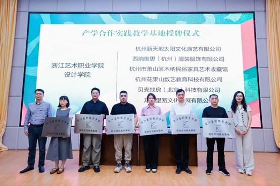 設(shè)計(jì)學(xué)院分別與杭州新天地太陽文化演藝有限公司,西納維思(杭州)服裝服飾有限公司,杭州市蕭山區(qū)木納民俗家具藝術(shù)收藏館,杭州花果山數(shù)藝教育科技有限公司,貝殼找房(北京)科技有限公司,龍泉望甌文化發(fā)展有限公司簽訂產(chǎn)學(xué)合作實(shí)踐教學(xué)基地合作協(xié)議并授牌,進(jìn)一步深化校企合作,構(gòu)建協(xié)同育人新格局。