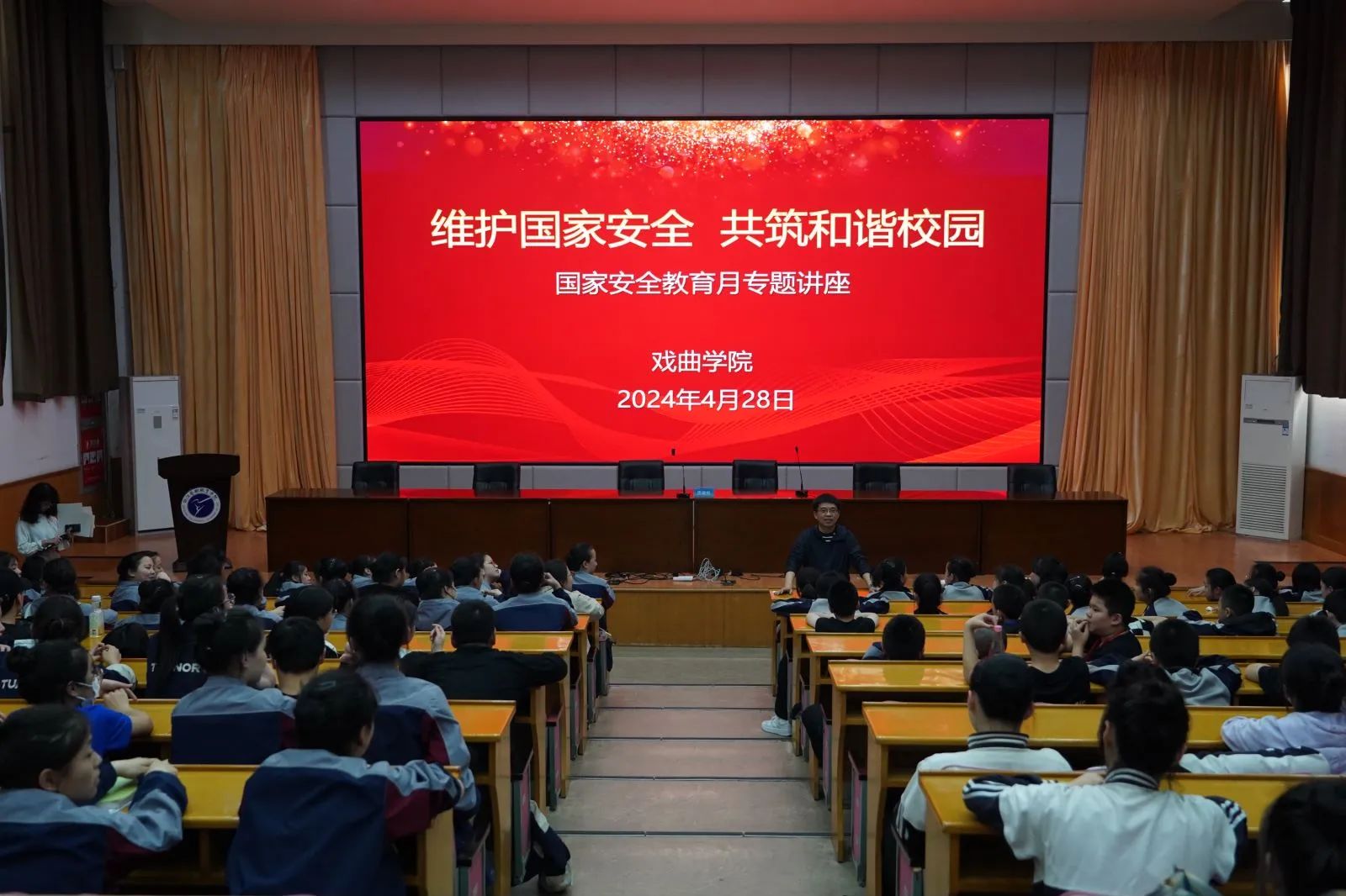 4月28日,戲曲學院開展校園安全教育專題講座,特邀杭州市公安局濱江分局一級警長沈建松警官為師生們授課。